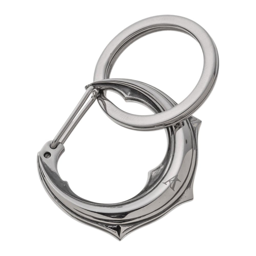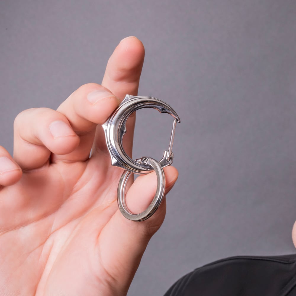 A crescent moon motif carabiner keychain, crafted in a layered, treasury-inspired 3D design that embodies the unique style of ARTEMIS KINGS. The large quick-clip mechanism ensures smooth and easy use. Attach your keys to the key ring to customize them with a stylish touch while adding a refined accent to your belt loop or bag. It also works beautifully as a bag charm. The mysterious crescent moon form brings a subtle individuality and elegance to everyday life.
