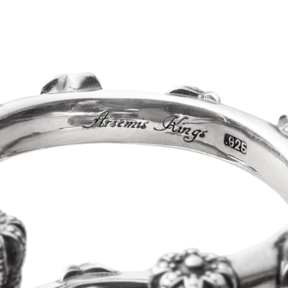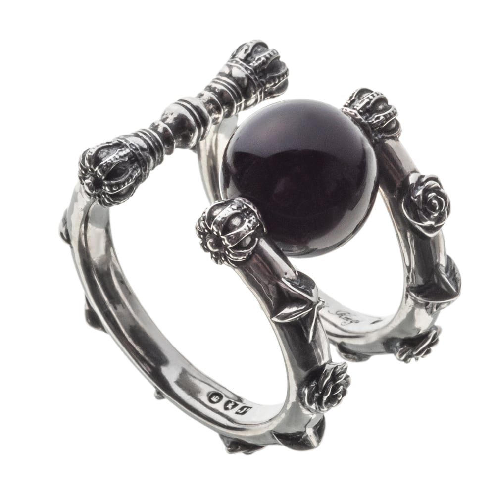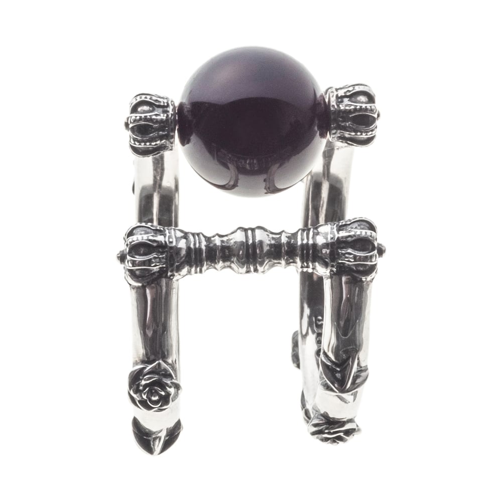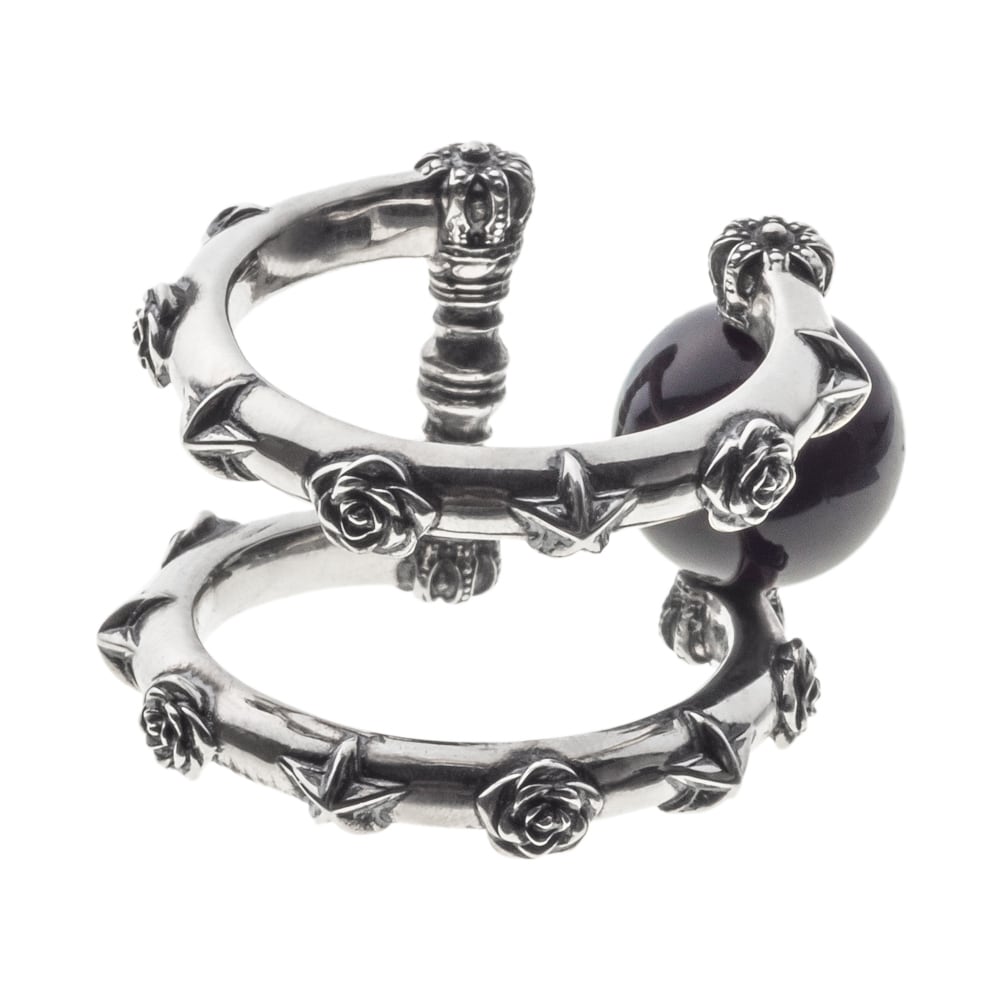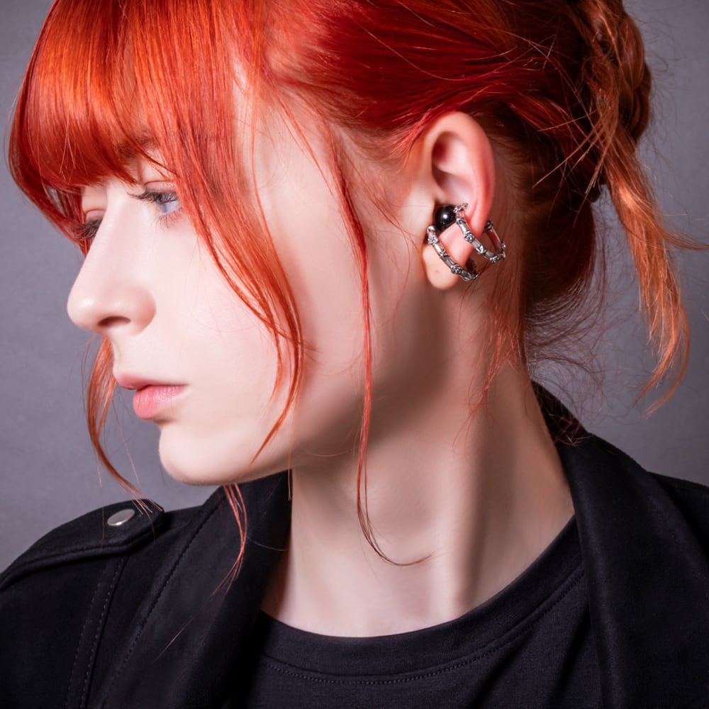 薔薇と星が交互に並ぶ華やかな2連イヤーカフ。耳の内側にはオニキスボールが輝き、現代アートのような印象的なデザインに。2連をつなぐ支柱には王冠モチーフと、アンティーク家具の脚を思わせる繊細な彫刻を施しました。ピアスホール不要で、耳に挟むだけの簡単装着。しっかりフィットし、着け心地も快適です。裏面にはブランド名と925刻印、3つのホールマーク付き。