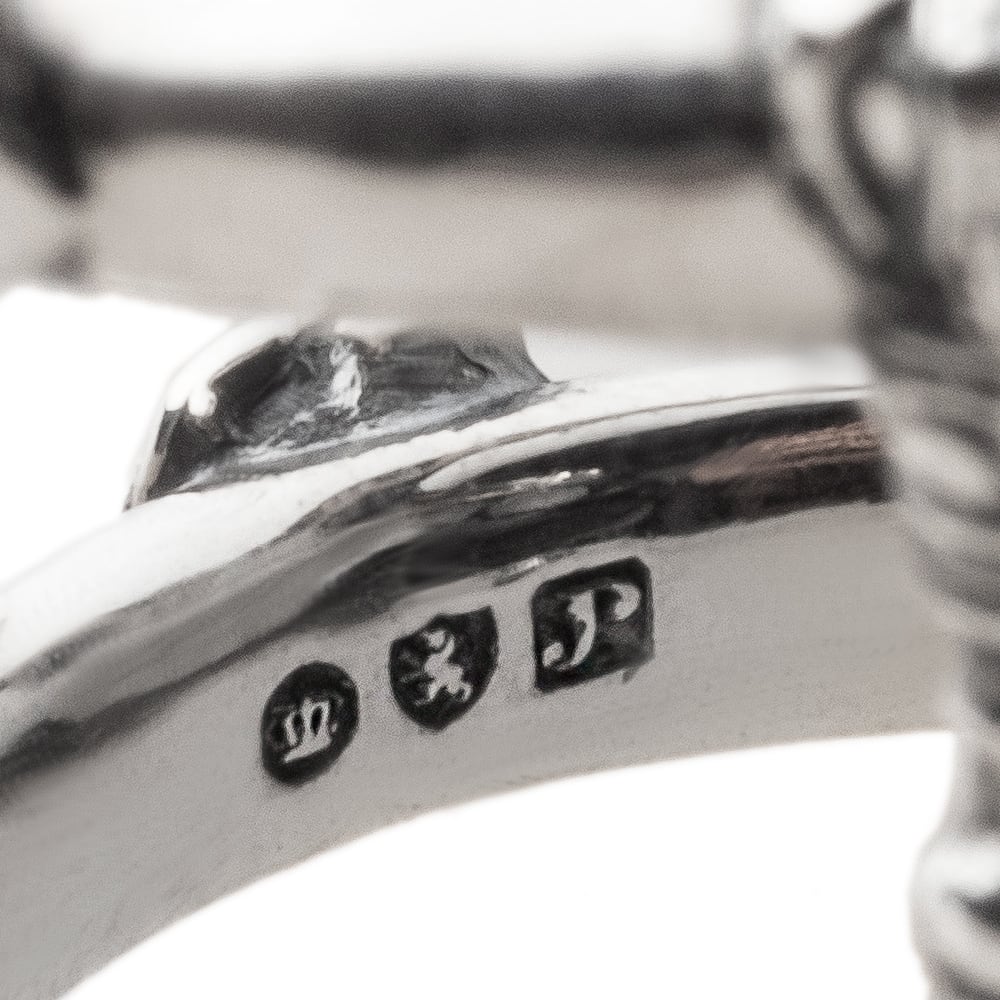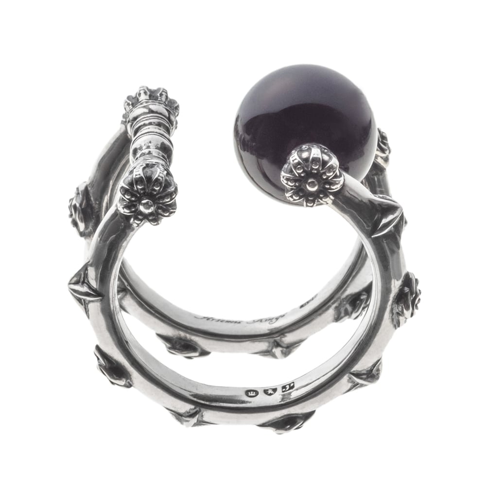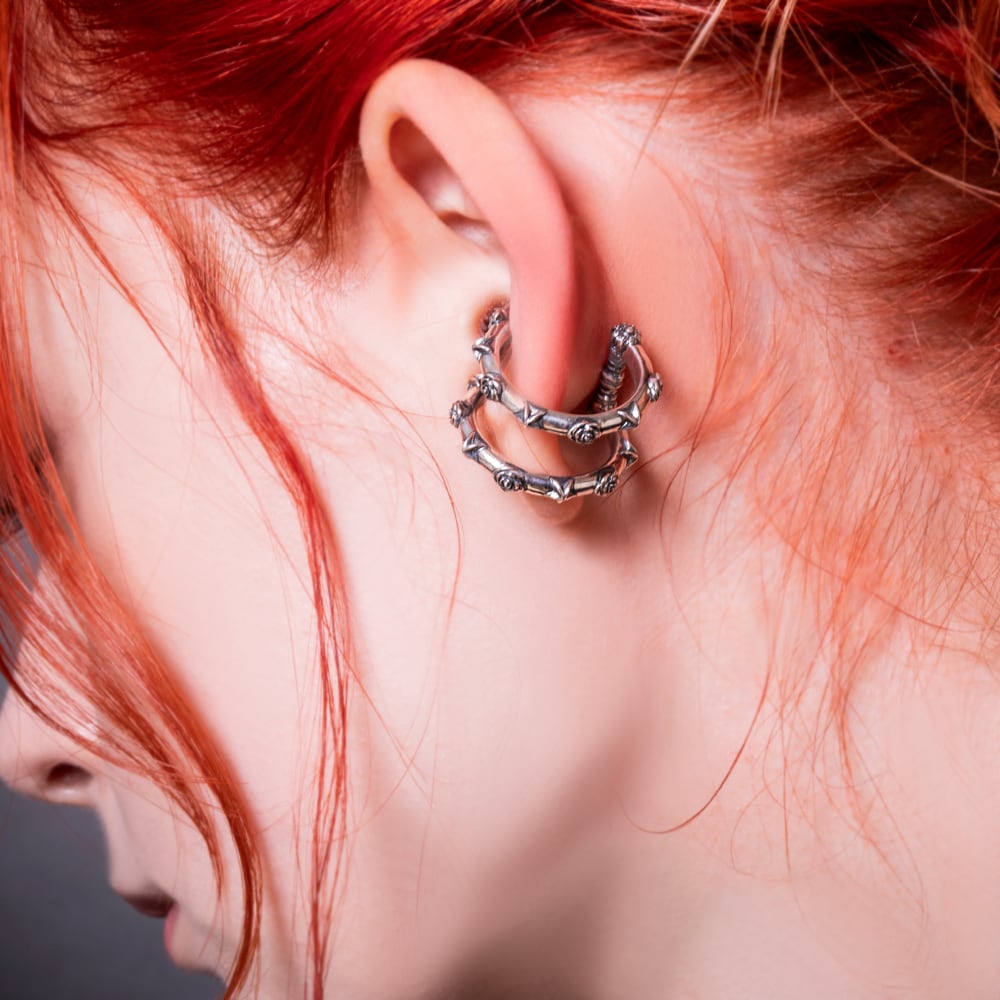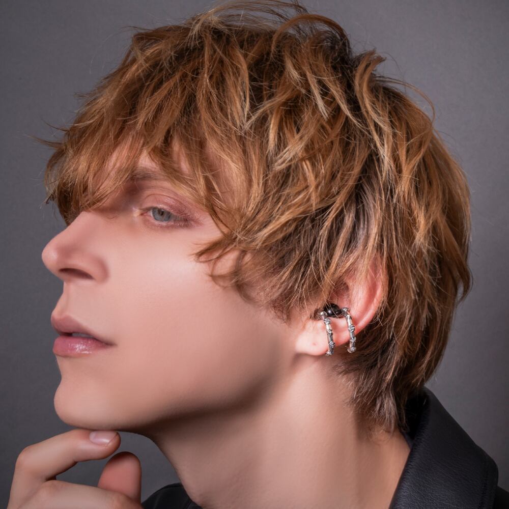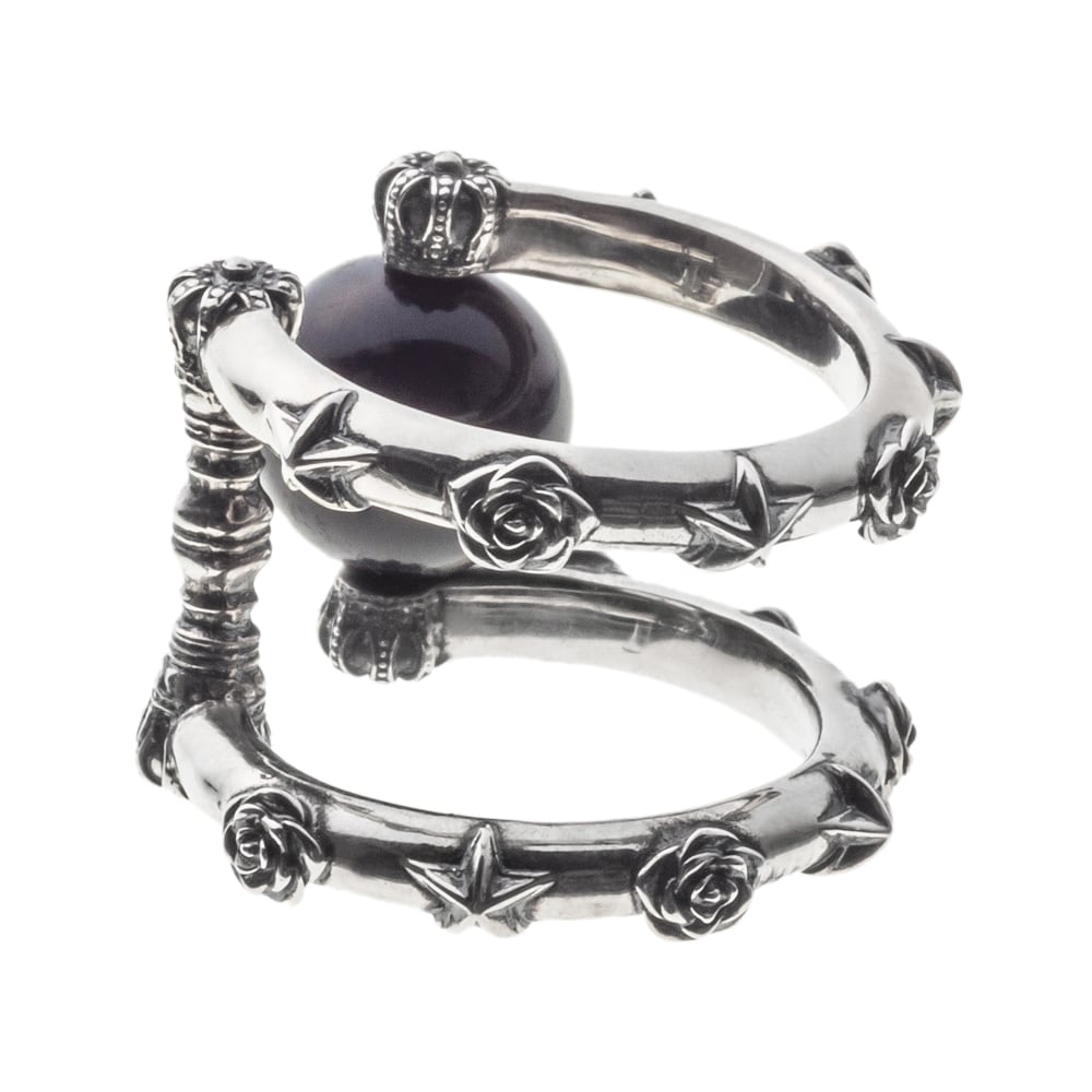薔薇と星が交互に並ぶ華やかな2連イヤーカフ。耳の内側にはオニキスボールが輝き、現代アートのような印象的なデザインに。2連をつなぐ支柱には王冠モチーフと、アンティーク家具の脚を思わせる繊細な彫刻を施しました。ピアスホール不要で、耳に挟むだけの簡単装着。しっかりフィットし、着け心地も快適です。裏面にはブランド名と925刻印、3つのホールマーク付き。