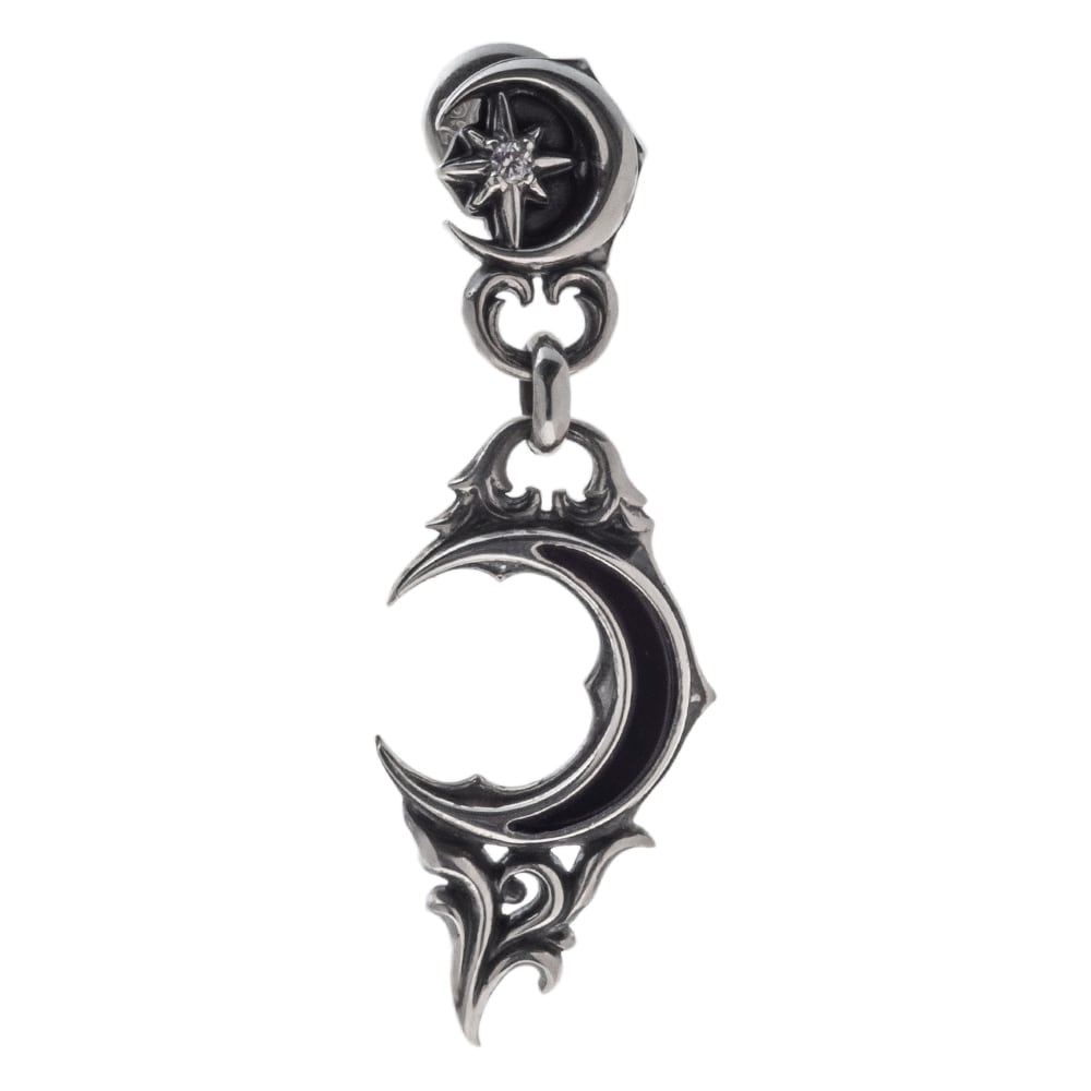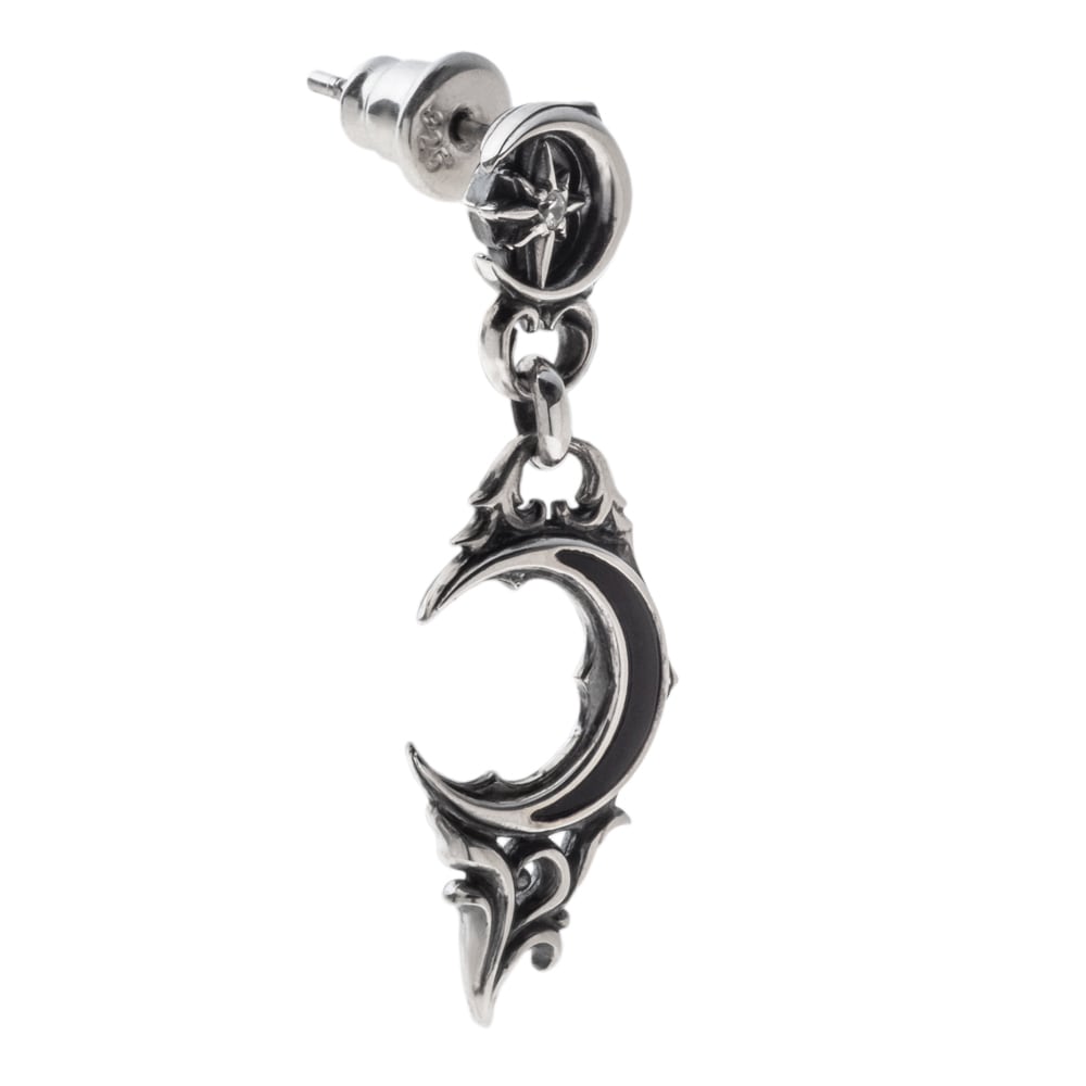 A slender crescent is shaped into a tracery-style layered silhouette and set with glossy synthetic onyx. A star at the stud and delicate scrollwork that sways below catch the light with every movement, lending a refined rhythm at the ear. On the reverse, our signature, 925 stamp, and three hallmarks are neatly finished—details considered from every angle.