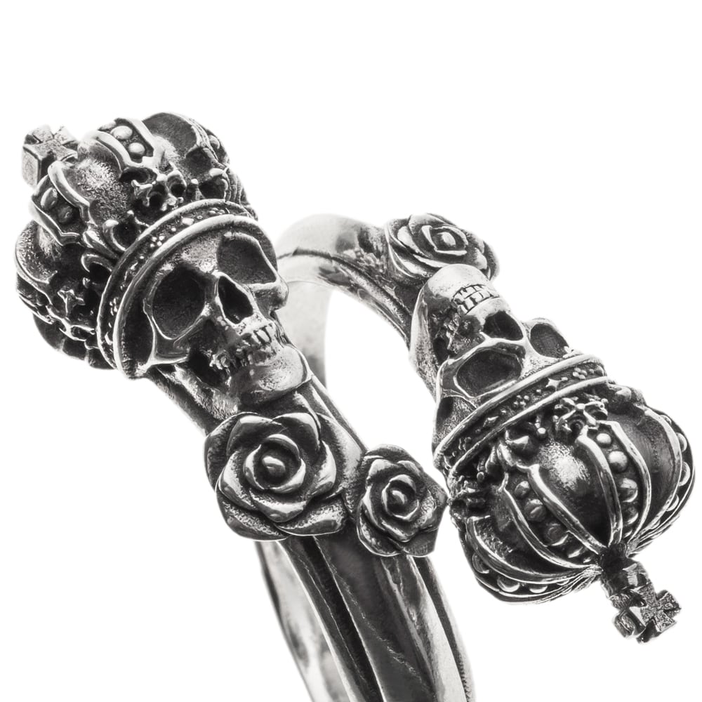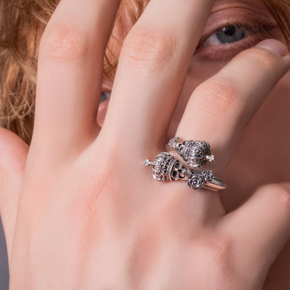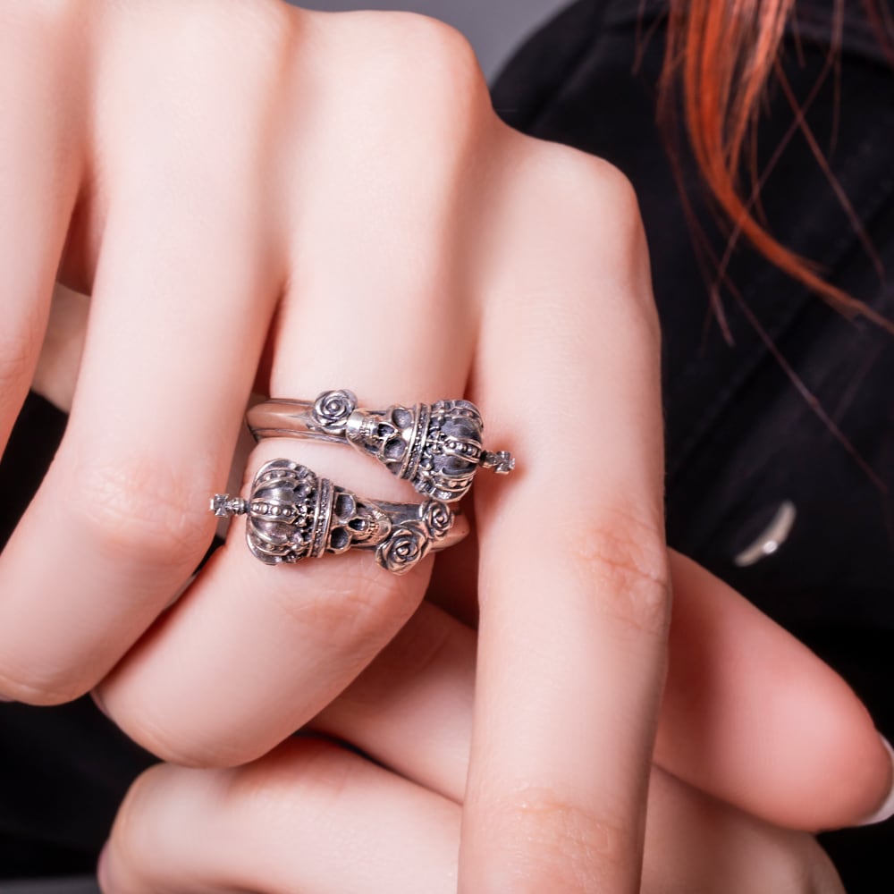 A free-size skull crown ring featuring two crowned skulls that wrap around the finger. Intricately sculpted roses and crowns embody both quiet presence and regal dignity. Inside the band, the phrase “Memento Mori” (“Remember you must die”) is engraved, conveying a powerful message to cherish the present. This artful piece blends jewelry-like beauty with dark spirituality. The brand logo, hallmark, and 925 stamp serve as marks of authenticity, making it a finely crafted creation.