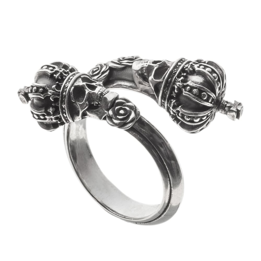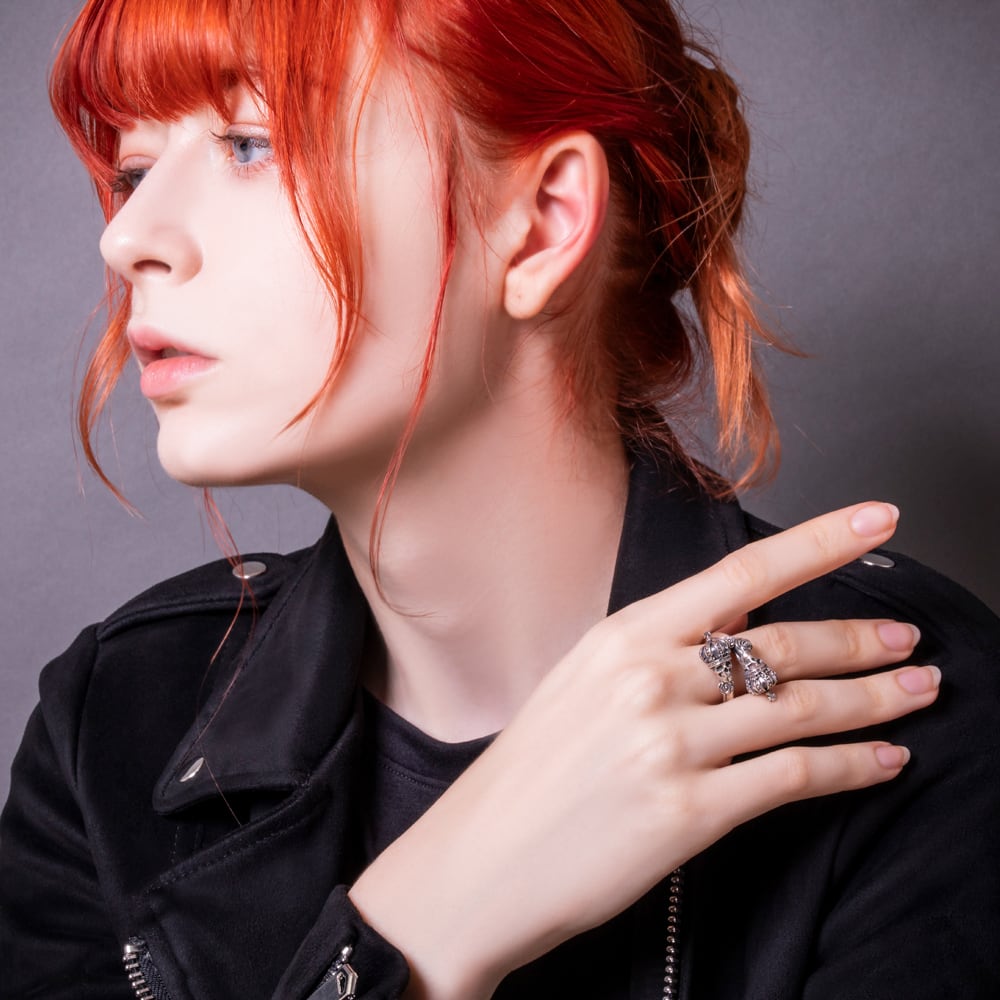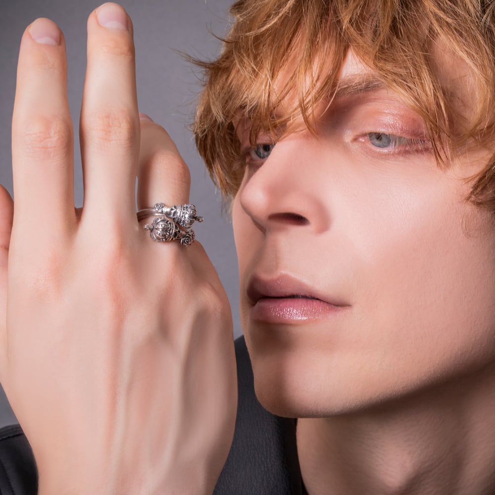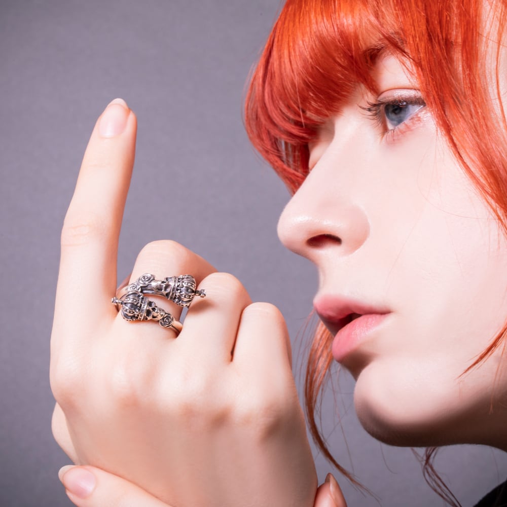 A free-size skull crown ring featuring two crowned skulls that wrap around the finger. Intricately sculpted roses and crowns embody both quiet presence and regal dignity. Inside the band, the phrase “Memento Mori” (“Remember you must die”) is engraved, conveying a powerful message to cherish the present. This artful piece blends jewelry-like beauty with dark spirituality. The brand logo, hallmark, and 925 stamp serve as marks of authenticity, making it a finely crafted creation.