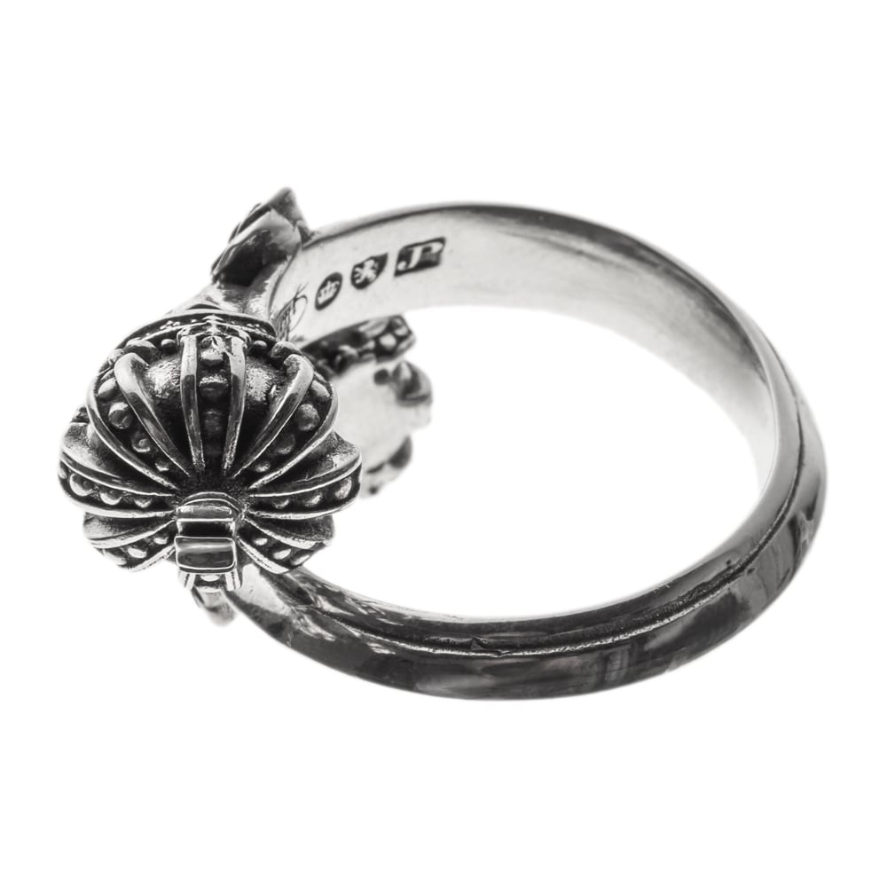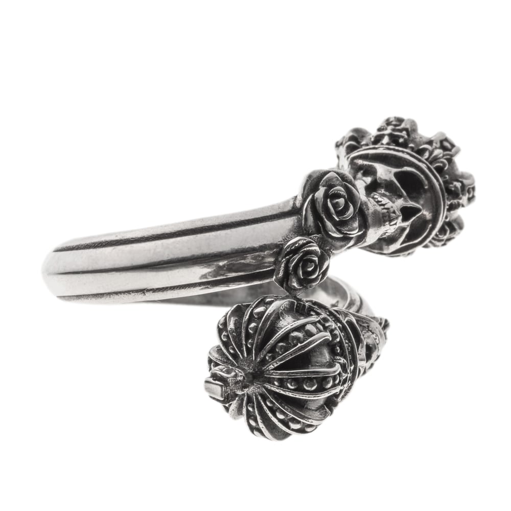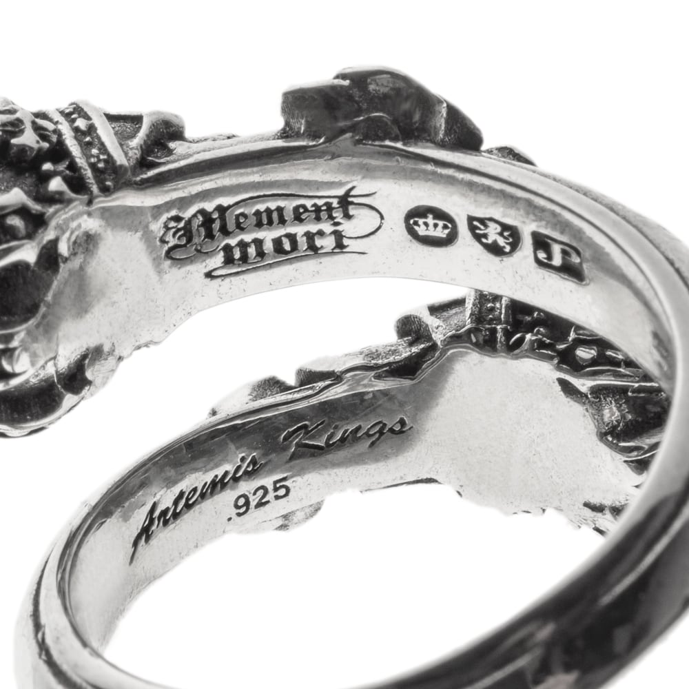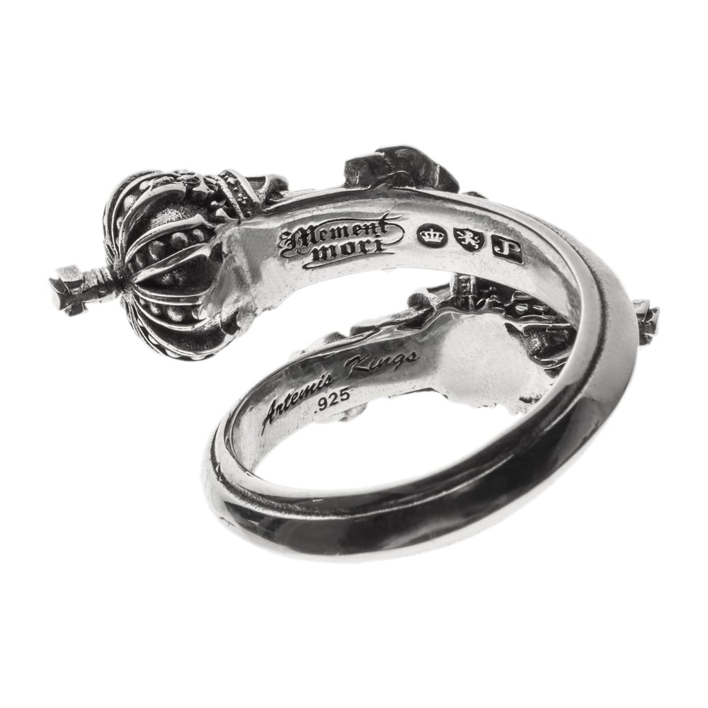 両端に配されたクラウンを戴く2つのスカルが指に絡みつくようなフリーサイズのスカルクラウンリング。緻密に彫刻された薔薇と王冠が、静かな存在感と気高さを宿す。リング内側には「Memento Mori(死を忘れるな)」のメッセージが刻まれ、"今を大切に生きろ"という力強い意志を伝える。ジュエリーライクな美しさとダークな精神性が融合したアートなリング。ブランドロゴとホールマーク、925刻印が確かな証となる、精巧な逸品。