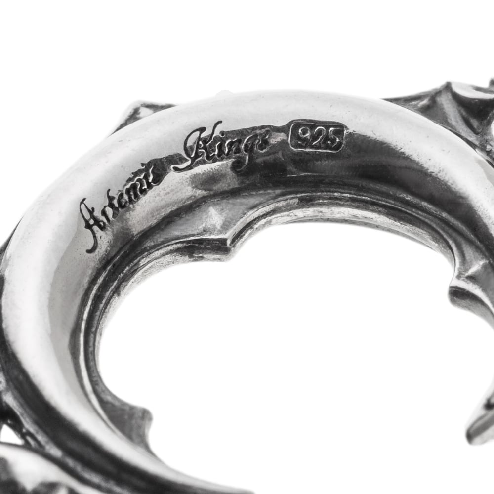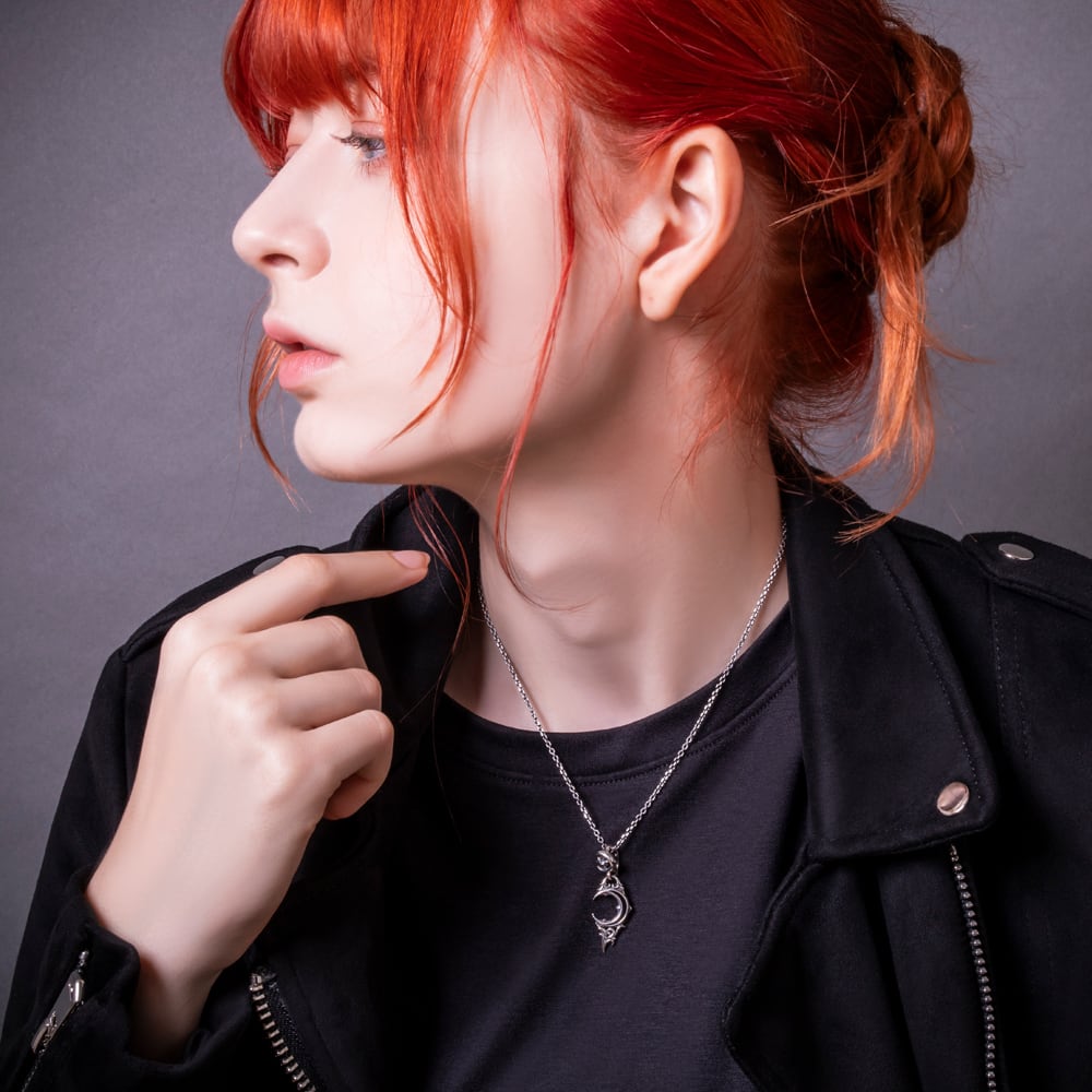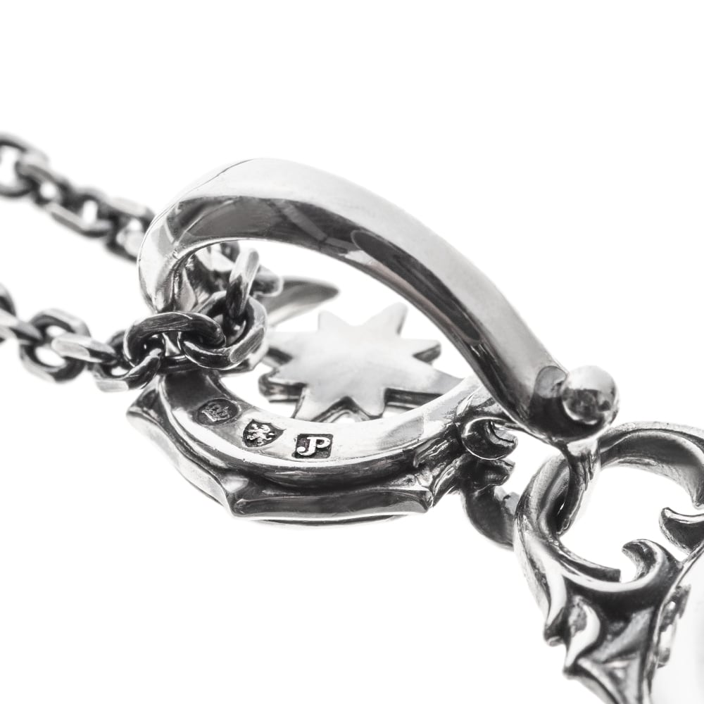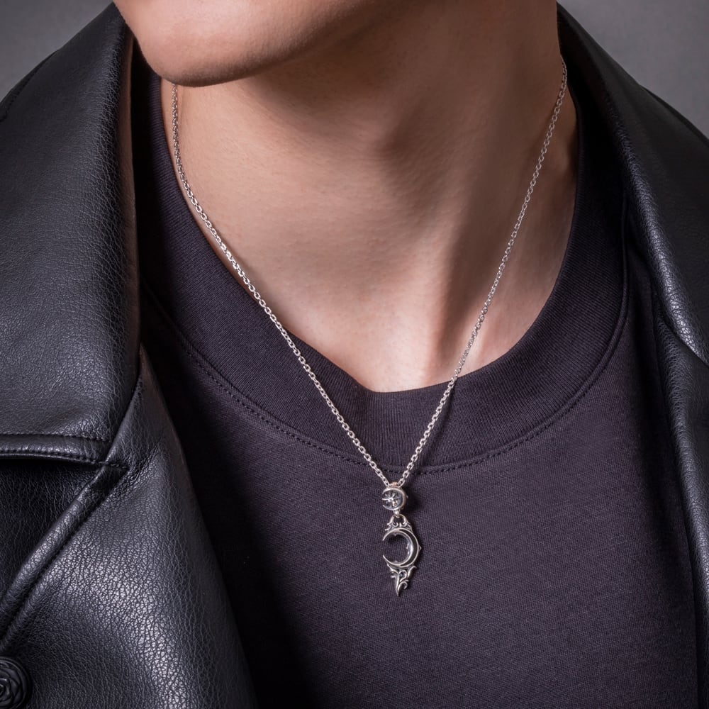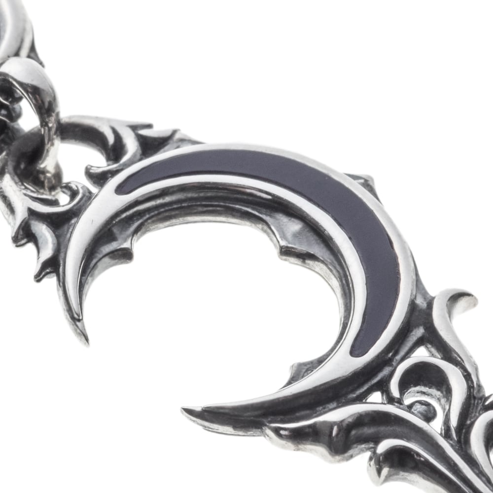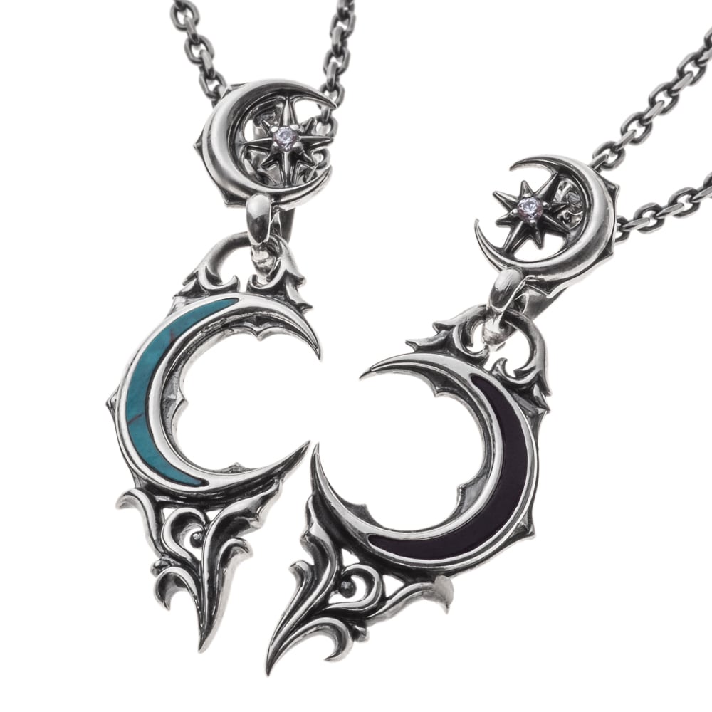 新月を抱く、神秘と優美のペンダント。エレガントに描かれた三日月モチーフは、トレサリー風のレイヤードデザインに、漆黒のシンセティックオニキスをセッティング。星が瞬くバチカンや下部の唐草も、繊細に装飾されています。裏面にはブランドロゴと925、3つのホールマークを刻印。さらに、青緑色の染色大理石バージョンと合わせることで、美しいハート型を形づくるペアデザインに。同シリーズのピアスとのコーディネートもおすすめ。月の魅力を、胸元から引き立ててくれます。