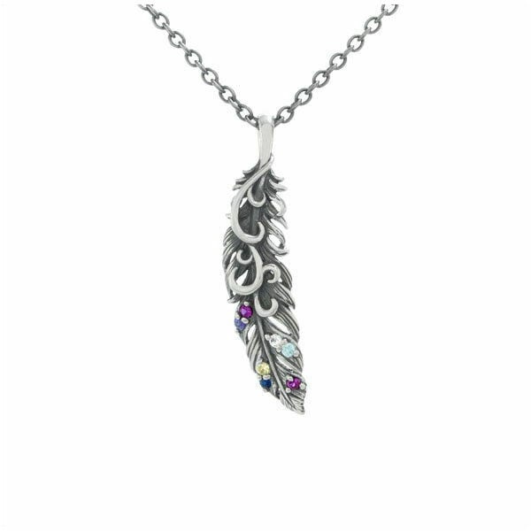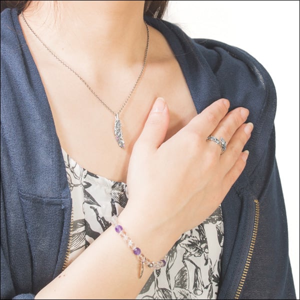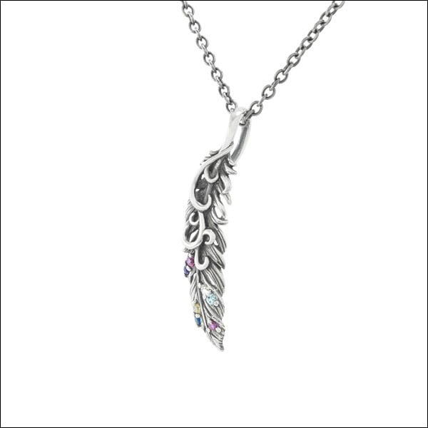 繊細なフェザーモチーフのチャームを彩る様々なカラーの輝石が胸元を彩ります。