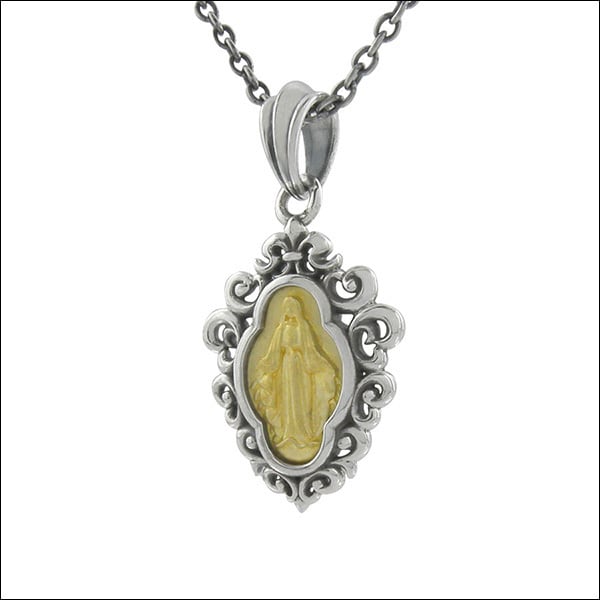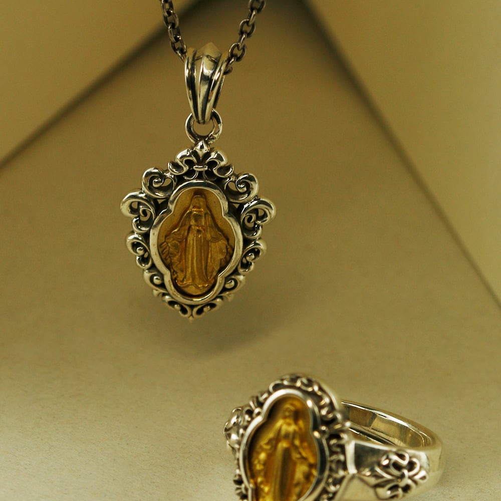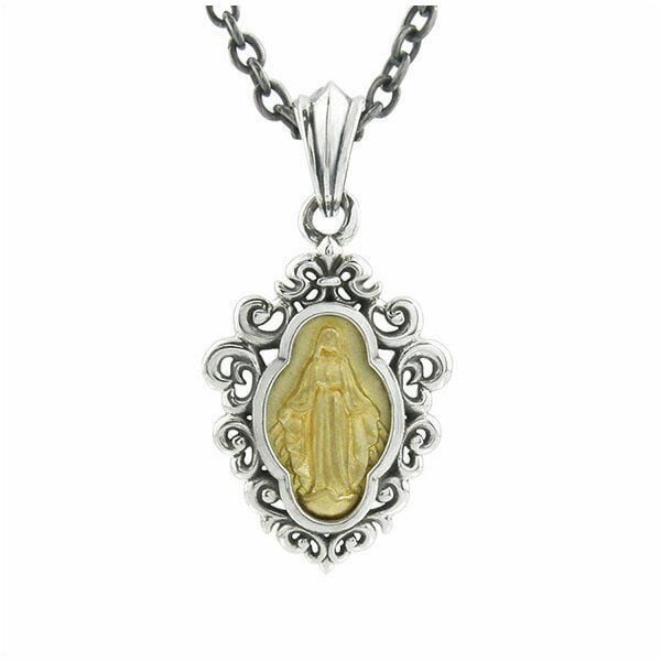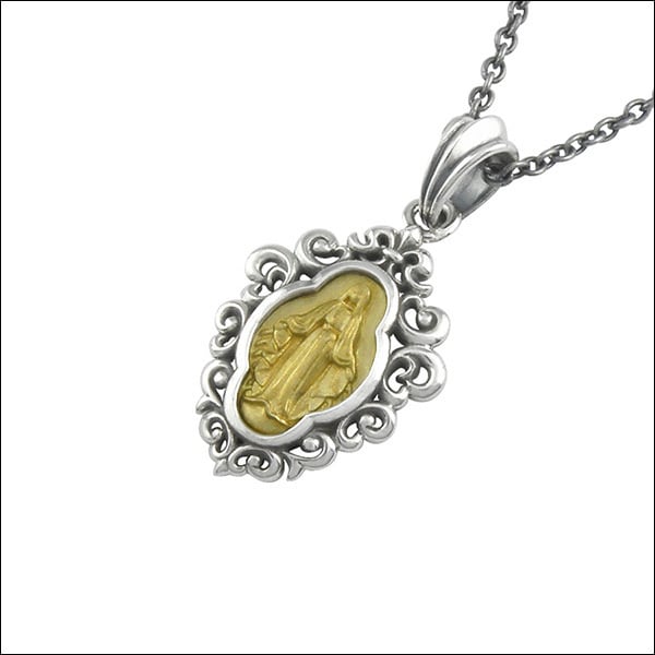 ゴシックな唐草模様のフレームに覆われた真鍮製のマリアがアンティークな雰囲気のペンダントトップ。