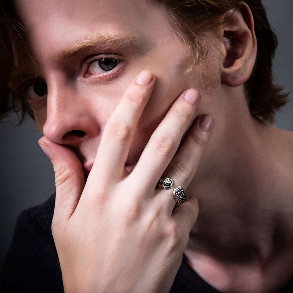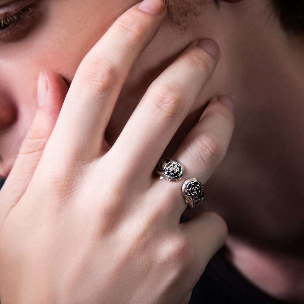 A limited-edition custom ring featuring an LTD engraving, serial number, and your chosen birthstone. This cuff-style, free-size ring is built on an openwork arabesque base, layered with rose-petal motifs and a delicate crown for refined dimension. The contrast of oxidized shadows and polished SV925 shine enhances its sculptural presence with every movement.