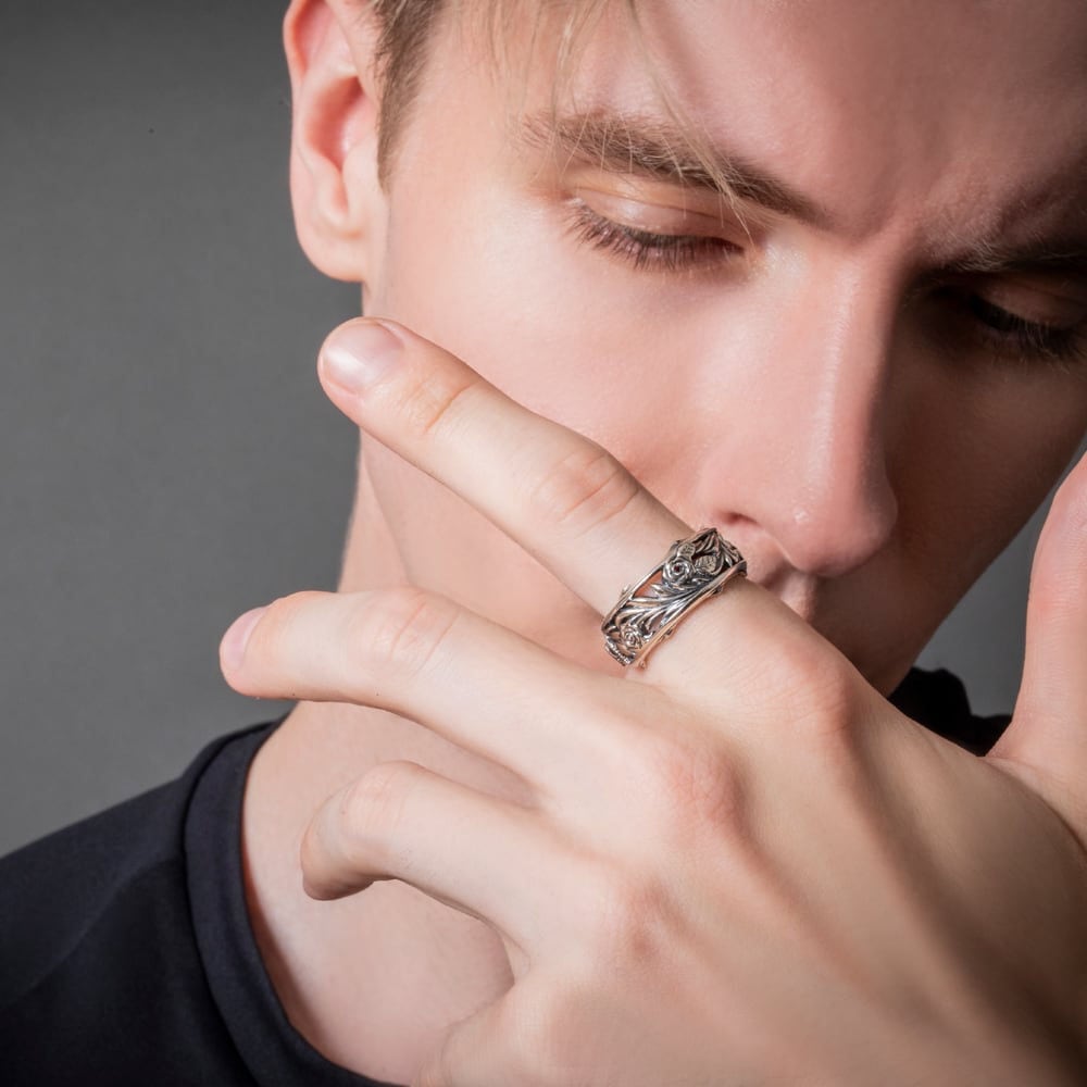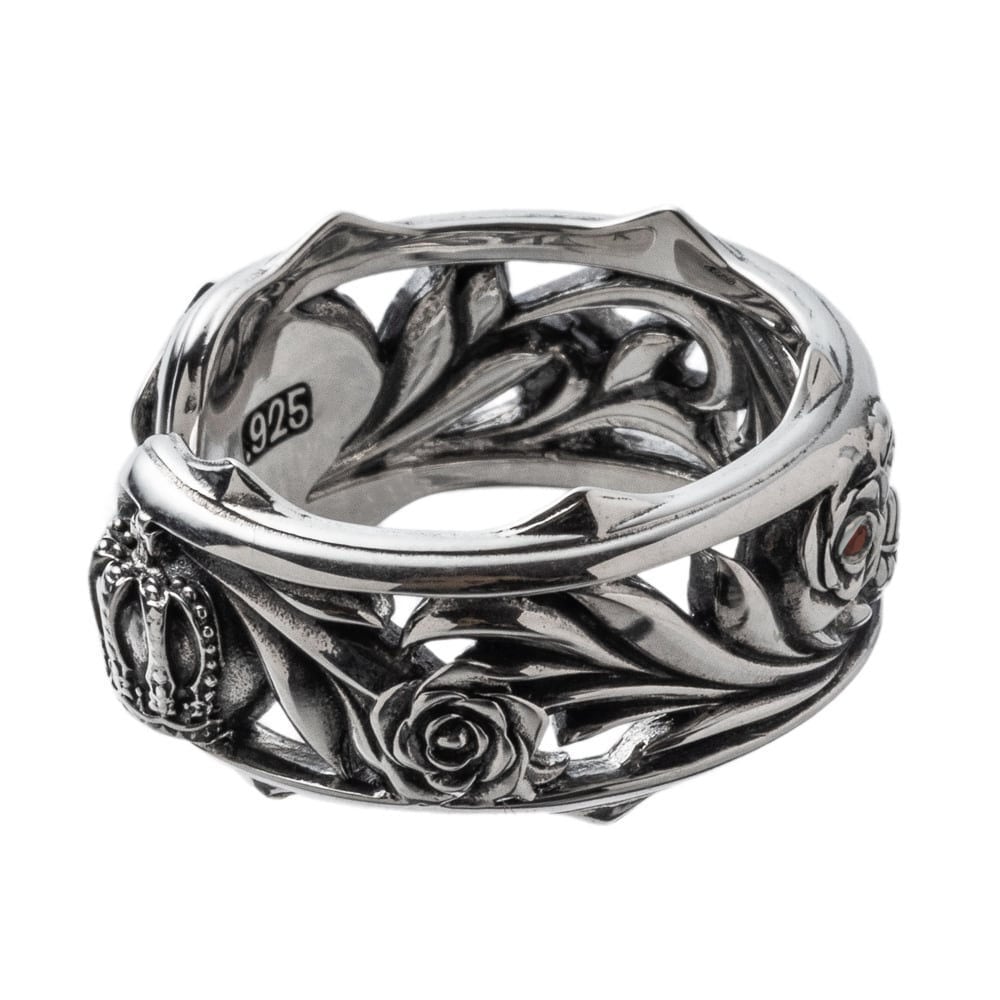LTDの刻印にシリアルナンバー入りの誕生石入りカスタムリング。透かし彫りのアラベスクをベースに、花弁のローズと繊細なクラウンを重ねたカフ式フリーサイズリングです。燻しを効かせたSV925の陰影と、鏡面の艶が呼応して、動くたびに立体感が際立つ設計。内側まで続く精緻なモチーフは、どの角度から見ても“絵になる”存在感を約束します。ブランド監修のもとアトリエ工房でサヴォワフェール(職人技)を注ぎ込み、エッジの処理から指あたりまで端正に仕立てました。愛と美を高めるラッキーモチーフであるローズを指先に。程よいボリュームながら装いにすっと馴染み、デイリーからドレスアップまで活躍します。9号から対応のフリーサイズで、ペアリングとしてもおすすめ。長く寄り添う、モダンなアートピースです。