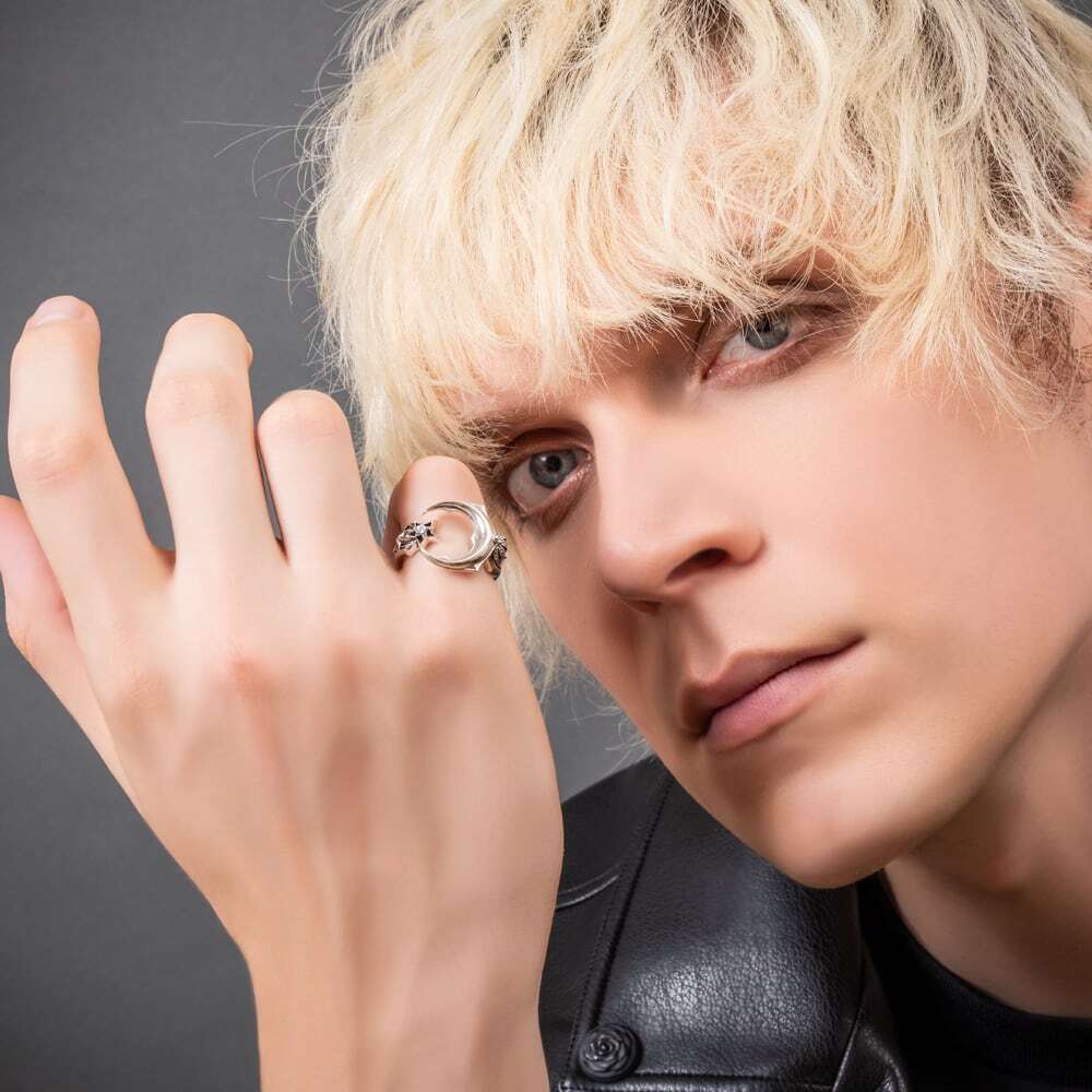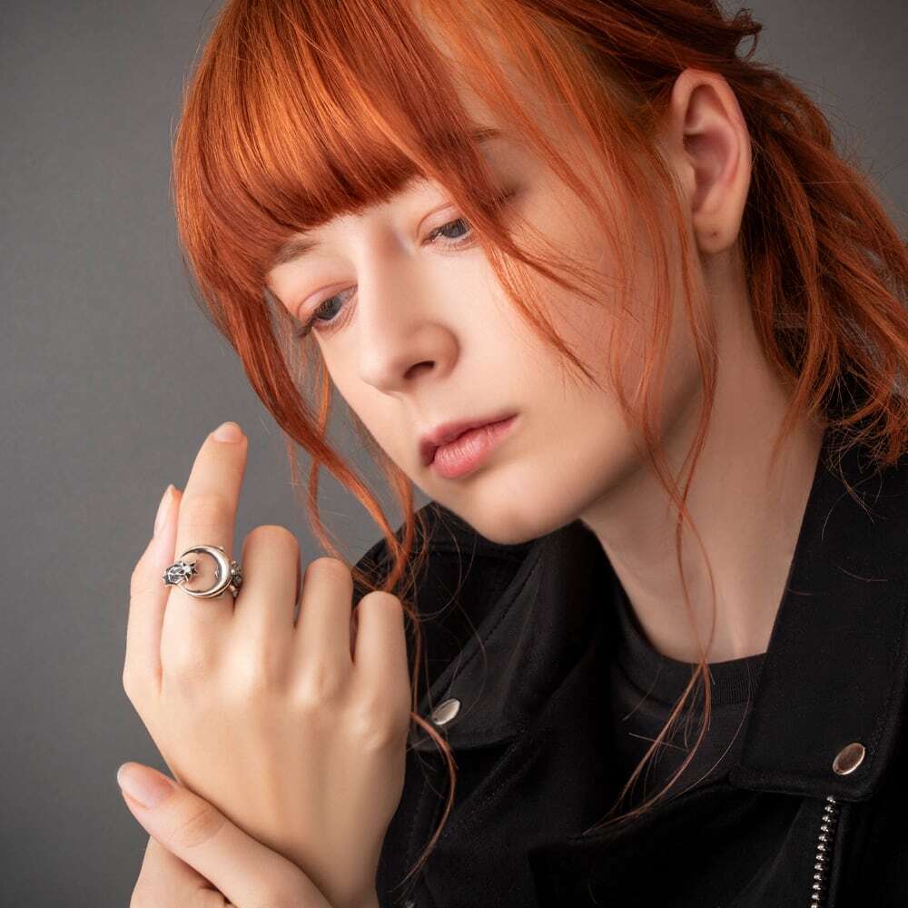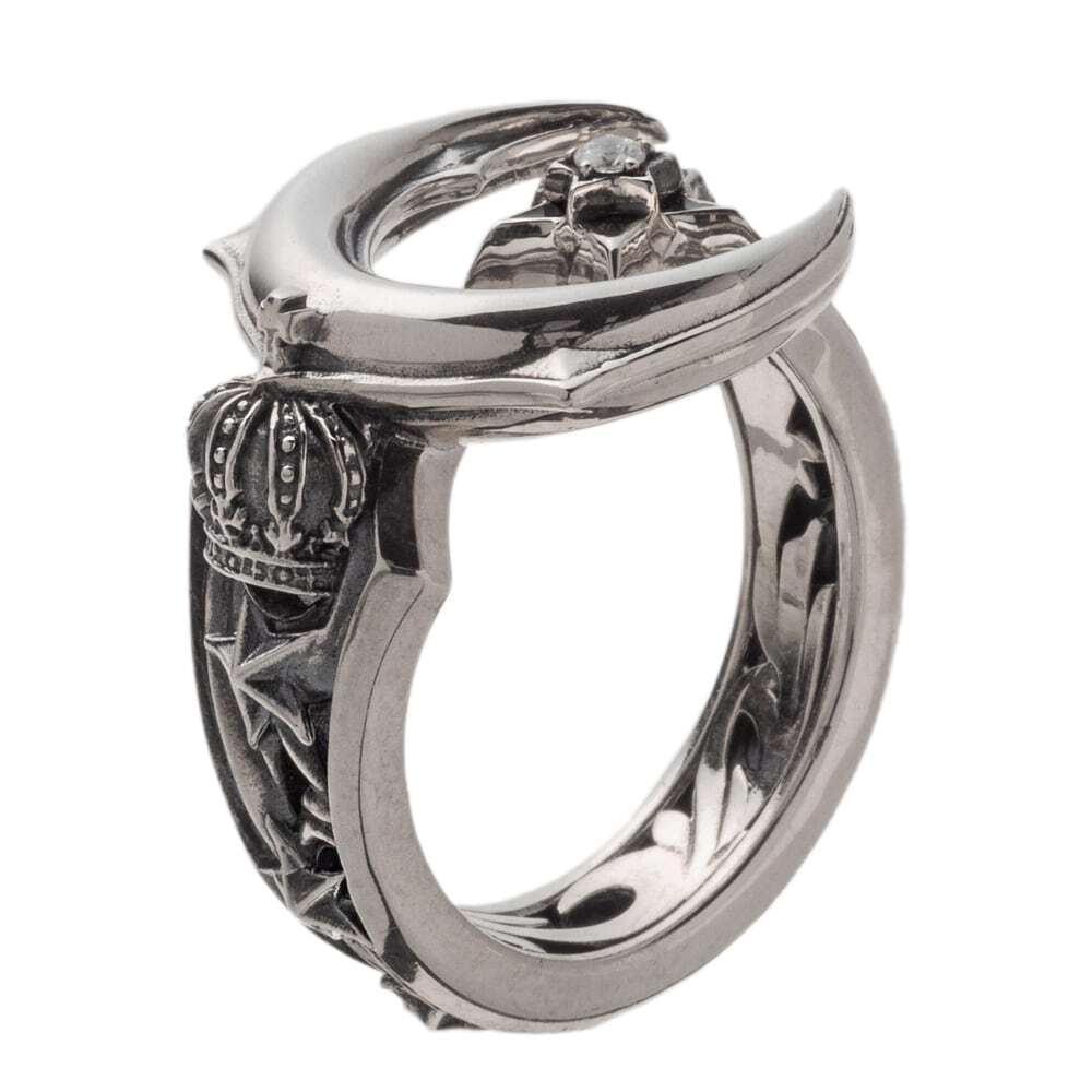エッジーな三日月がしなやかな弧を描き、中央では立体的に重ねたスターが微光を放つリングです。星の頂には誕生石を一点、黒エナメルの深淵に浮かべるようにセッティング。リングは星とアラベスクで透かしを効かせ、燻しを纏ったSV925の陰影が彫刻的な奥行きを生みます。新生と神秘を象徴する三日月の佇まいを、ブランド監修のもとアトリエ工房でサヴォワフェールを注ぎ、エッジの面取りから内側の磨きまで端正に仕立てました。内側にはAKと〈925〉LTDシリアルナンバーの刻印。日常からドレスアップまで、装いを一段引き上げるモダン・アートピースです。