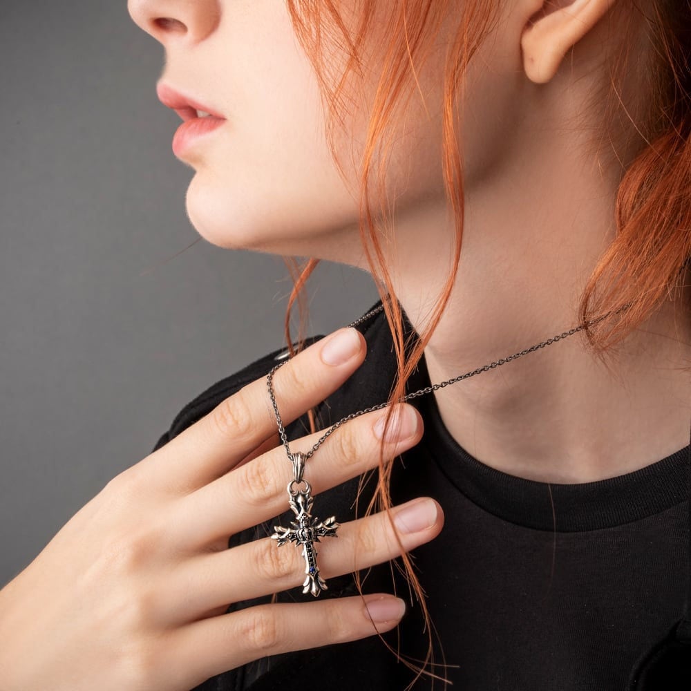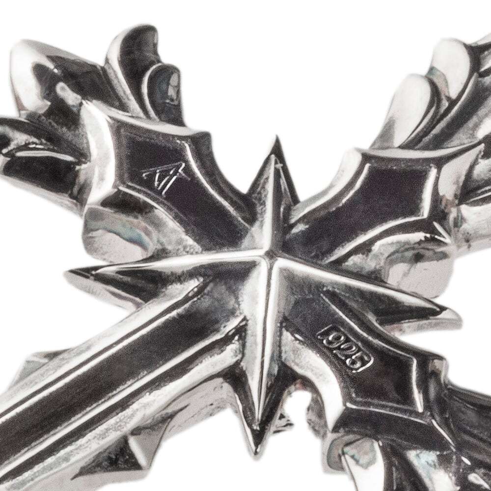 The triple-layered cross frame creates striking depth, while the central crown stands as a powerful symbol. At the heart of the cross, black CZ stones are pavé-set, and the oxidized finish of SV925 sterling silver enhances the sharp contrast of light and shadow across every edge.