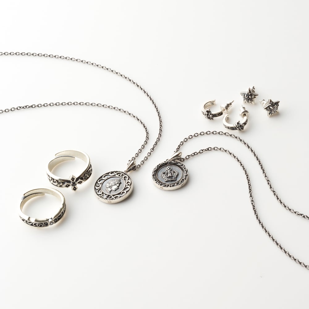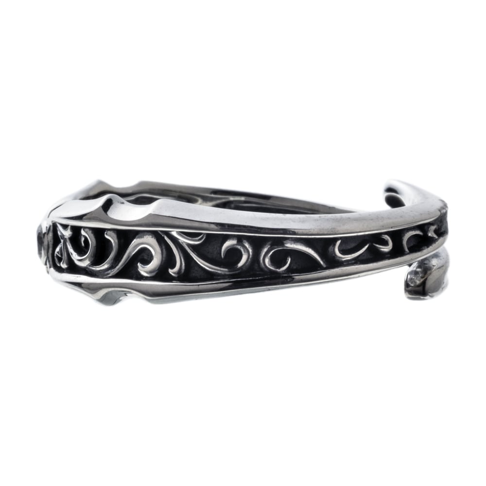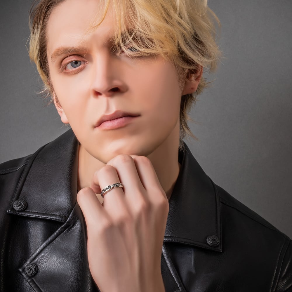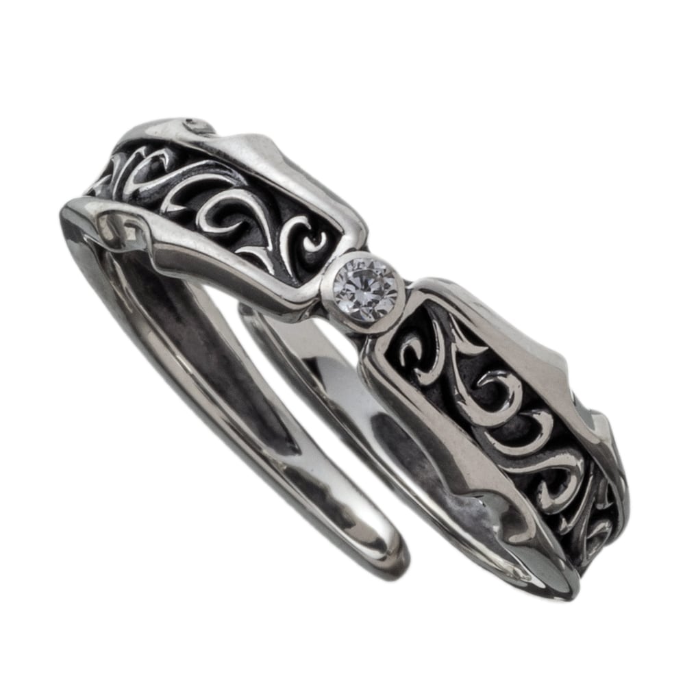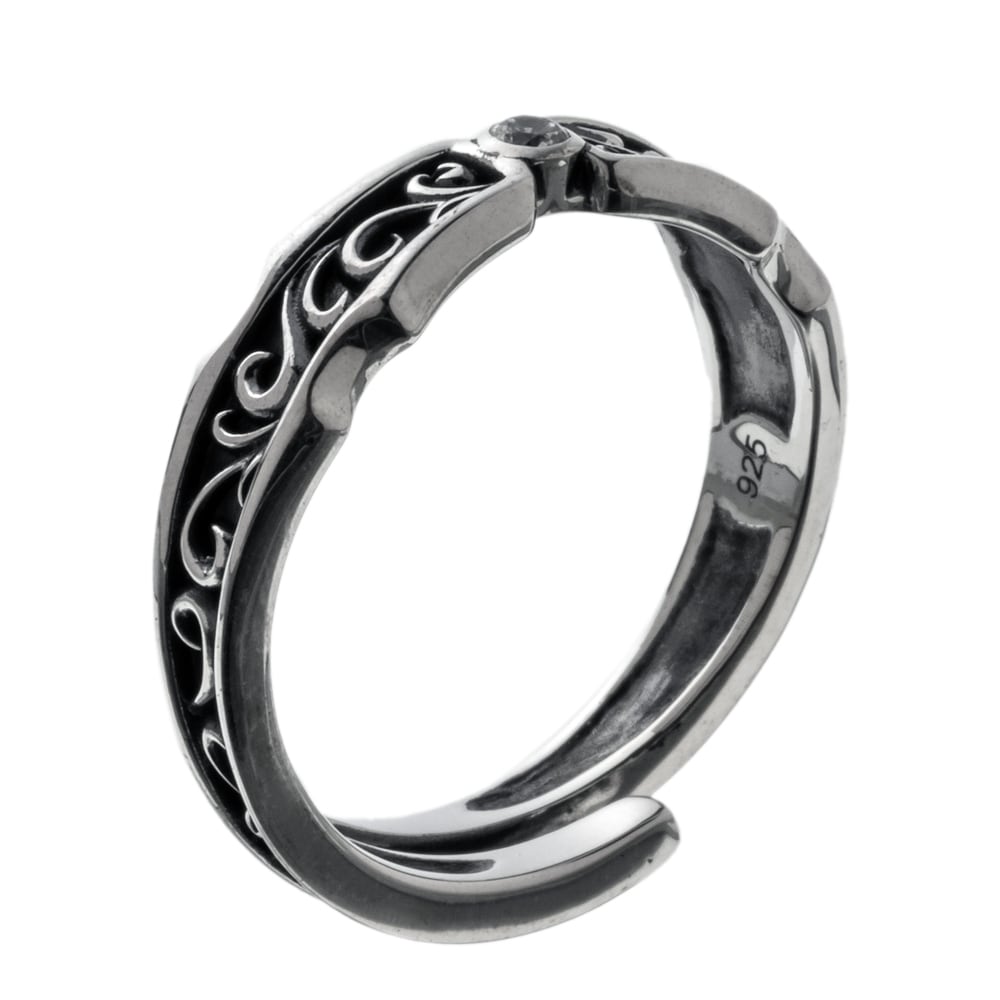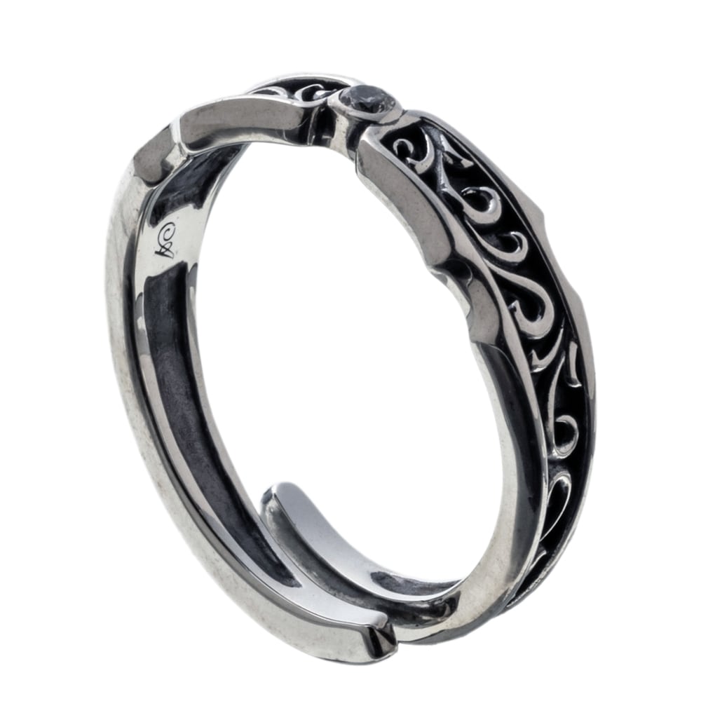 漆黒に浮かぶ唐草模様が、銀の艶と重なり合い、存在感を放つリング。センターにはラウンドブリリアントカットのストーンを一粒あしらい、静謐な輝きが細やかな曲線の装飾と響き合います。陰影と繊細な彫刻のコントラストは、クラシックでありながらもどこか前衛的。装う人の指先に、確かな意志と美意識を刻みます。ブランド監修のもと、信頼する提携アトリエ工房にて、熟練職人が一点一点仕立て上げたSV925。サヴォワフェール(職人技)が凝縮された造形は、単なるアクセサリーを超えて“アートピース”としての存在感を纏わせます。ユニセックスに楽しめるバランスで、日常にも特別な瞬間にも映えるデザイン。手元に添えるだけで、スタイル全体を格上げする洗練の証です。