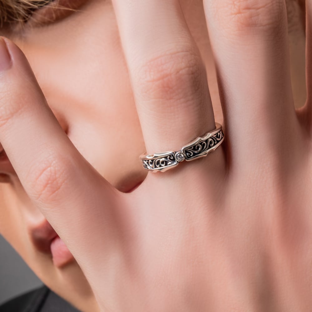A ring where arabesque patterns emerge from deep black, layered with the luster of silver to create a striking presence. At the center, a single round brilliant-cut stone adds a serene brilliance that resonates with the delicate flowing curves of the design. The contrast of shadows and intricate engraving feels both classic and subtly avant-garde, leaving a sense of refined will and aesthetic on the wearer’s fingertips.