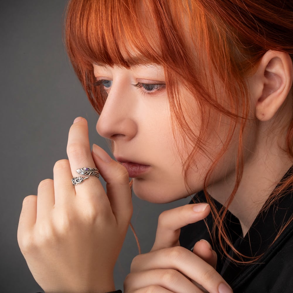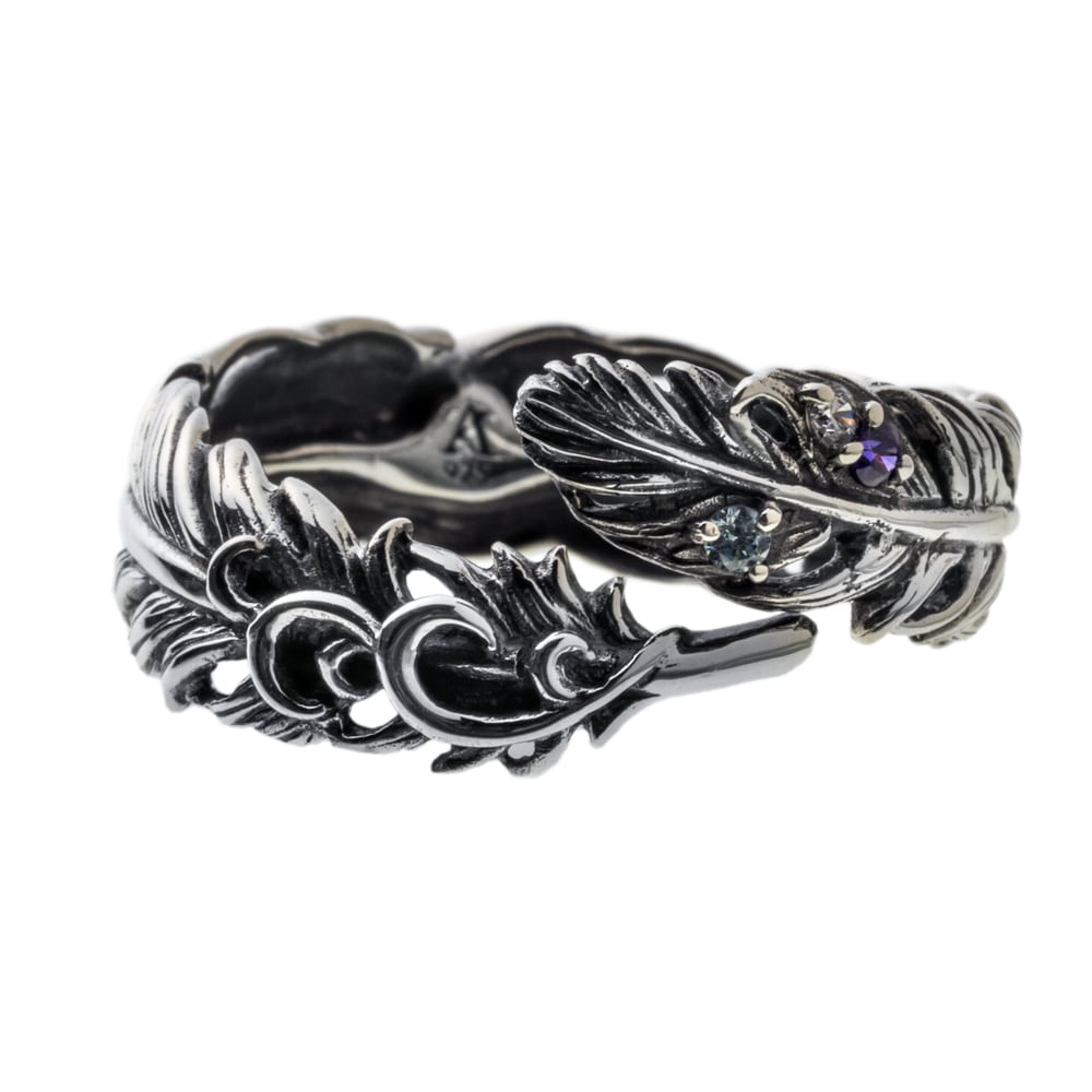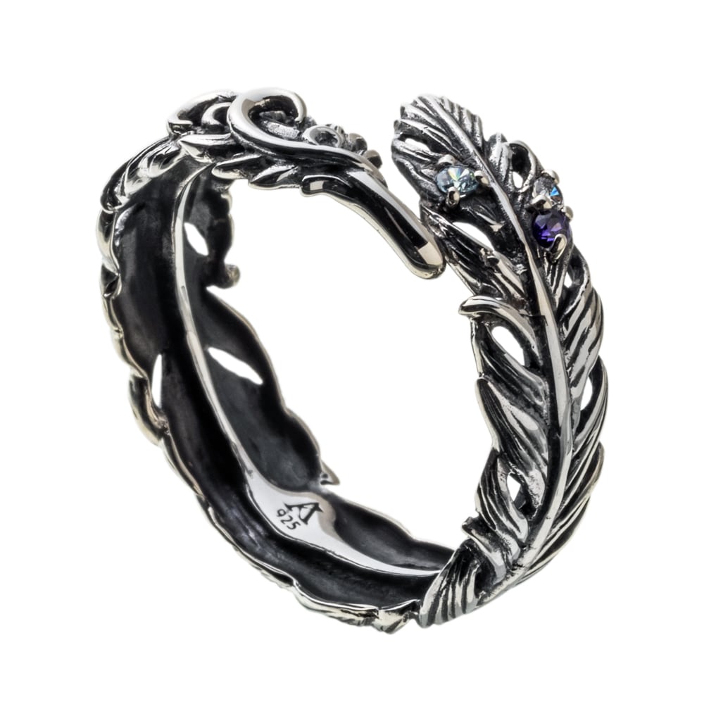 羽根がふと舞い降りた瞬間を留めた、フェザーリング。一本一本の羽軸から羽先の起伏まで緻密に彫り起こし、燻しを効かせたSV925が陰影のグラデーションを描きます。開放感のあるシルエットには小さなカラーストーンを点描のように配置。アイスブルー、ロイヤルパープル、クリアの微光がさざめき、手元に詩的なニュアンスを添えます。過剰な装飾に頼らず、現代彫刻のような軽やかさと気品を両立。ブランドの美意識を受け継ぐ提携アトリエにて、石留め、エッジの面取り、内側の磨きに至るまで熟練の手仕事で仕立てました。単体で凛と、他リングとのレイヤードでよりドラマティックに――日常を静かに格上げするコンテンポラリージュエリーです。