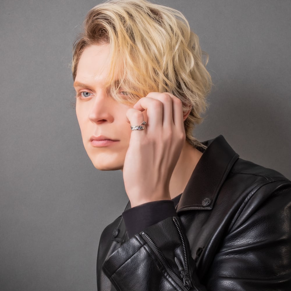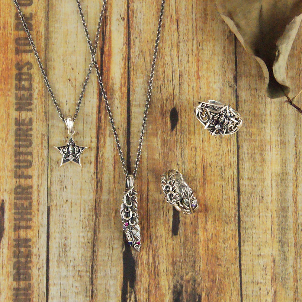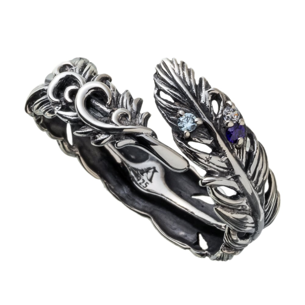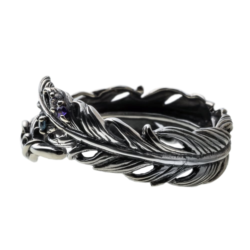 羽根がふと舞い降りた瞬間を留めた、フェザーリング。一本一本の羽軸から羽先の起伏まで緻密に彫り起こし、燻しを効かせたSV925が陰影のグラデーションを描きます。開放感のあるシルエットには小さなカラーストーンを点描のように配置。アイスブルー、ロイヤルパープル、クリアの微光がさざめき、手元に詩的なニュアンスを添えます。過剰な装飾に頼らず、現代彫刻のような軽やかさと気品を両立。ブランドの美意識を受け継ぐ提携アトリエにて、石留め、エッジの面取り、内側の磨きに至るまで熟練の手仕事で仕立てました。単体で凛と、他リングとのレイヤードでよりドラマティックに――日常を静かに格上げするコンテンポラリージュエリーです。