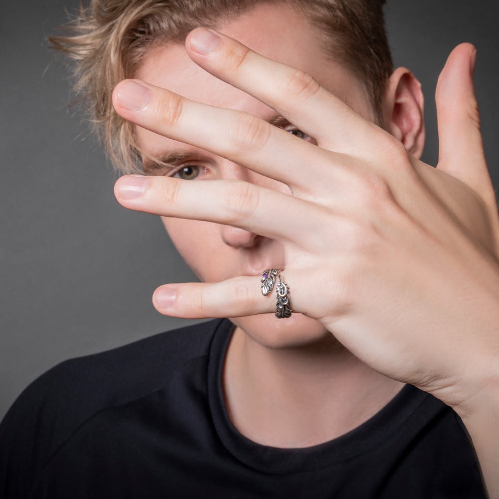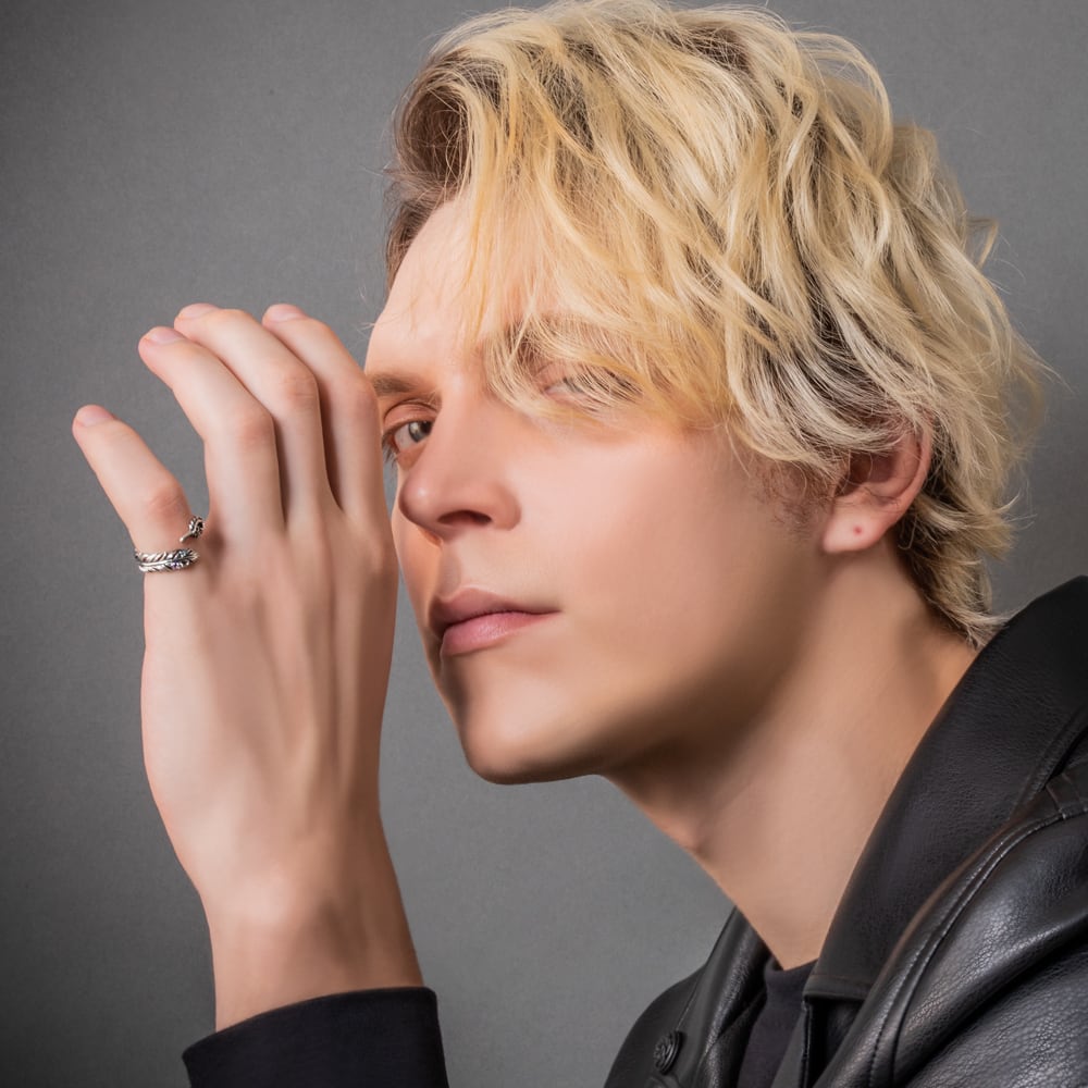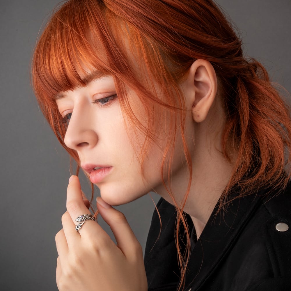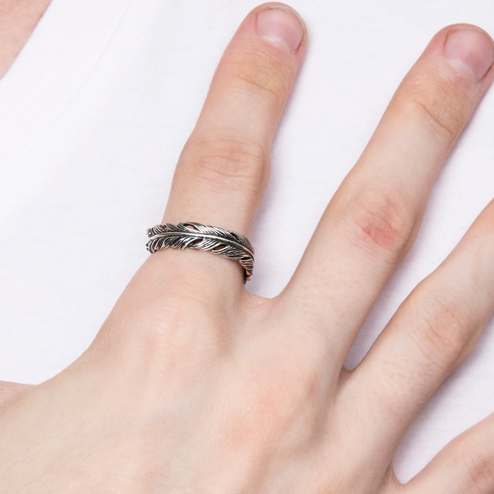 A feather ring capturing the fleeting moment a feather gently drifts down. Each detail—from the quill to the delicate contours of the tip—is meticulously carved, while the oxidized SV925 creates a rich gradient of light and shadow.