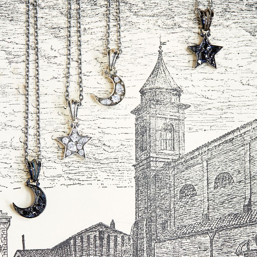 スターモチーフチャーム。贅沢にさまざまなカットのクリアジルコニアを散りばめたジュエリーライクなチャーム。ルテメッキを施したカラー違いのダークネススターチャームや、三日月モチーフのブリリアントムーンチャームなどと合わせてのペア使いもお勧めです。