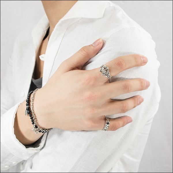 胸元に幸運と気品を重ねる〈クラウンホースシュー・リング〉。古来より魔除けや繁栄の象徴とされる馬蹄に、精巧なクラウンを重ね合わせ、力強さと優雅さを兼ね備えた意匠に仕立てました。センターには一粒のジルコニアをセッティングし、凛とした煌めきがアクセントとなって全体を引き締めます。アームには唐草のモチーフを緻密に彫り込み、流れるような曲線が指先に豊かな表情を添えます。立体感のあるボリュームながら、内側はなめらかに整えられており、快適な着け心地を実現。アトリエにて熟練の職人が一点一点を丁寧に成形し、鏡面の艶と燻しの陰影が呼応する仕上がりは、まさに小さな彫刻作品のよう。ジュエリーでありながらモダンなオブジェのような存在感を放ち、日常のスタイルにも特別なシーンにもふさわしい逸品です。身につける人に静かな自信と華やぎを授ける、永く愛されるリングです。
