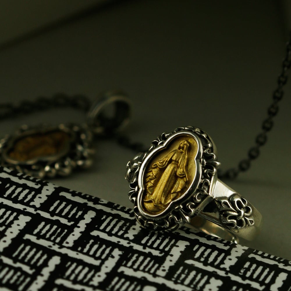 A ring that fuses solemn grace with modern edge. At its center, a brass Madonna radiates an antique aura, framed by a gothic arabesque design that brings an air of timeless storytelling to the hand. Delicate fleur-de-lis motifs on each side symbolize elegance and devotion, while the deep brilliance of sterling silver contrasts beautifully with the warm, subdued gold tone of brass—an interplay of light and shadow that commands quiet yet undeniable presence.