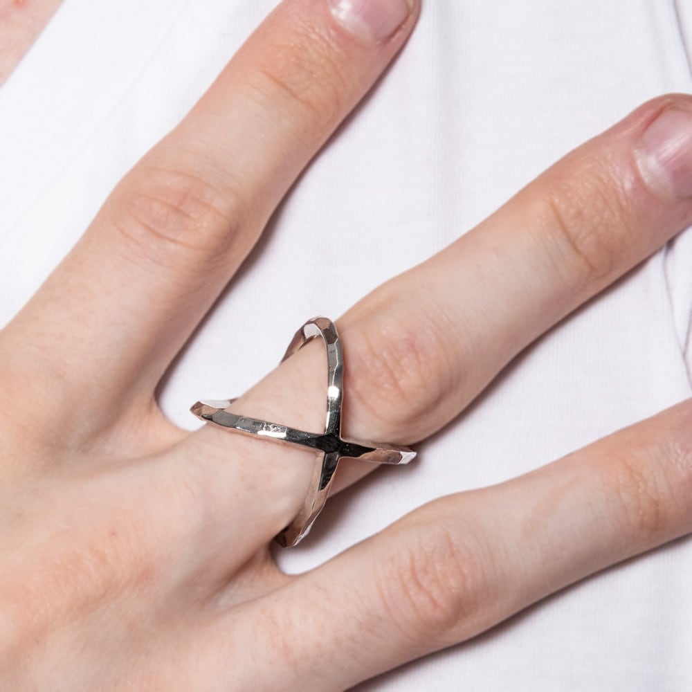 Crossing flat bands with a subtle hammered texture create an architectural “X” that can be worn two ways—flip it for a reversible look that shifts from bold to minimal in an instant. Available in both men’s and women’s sizes, it’s an effortless choice for pairing.