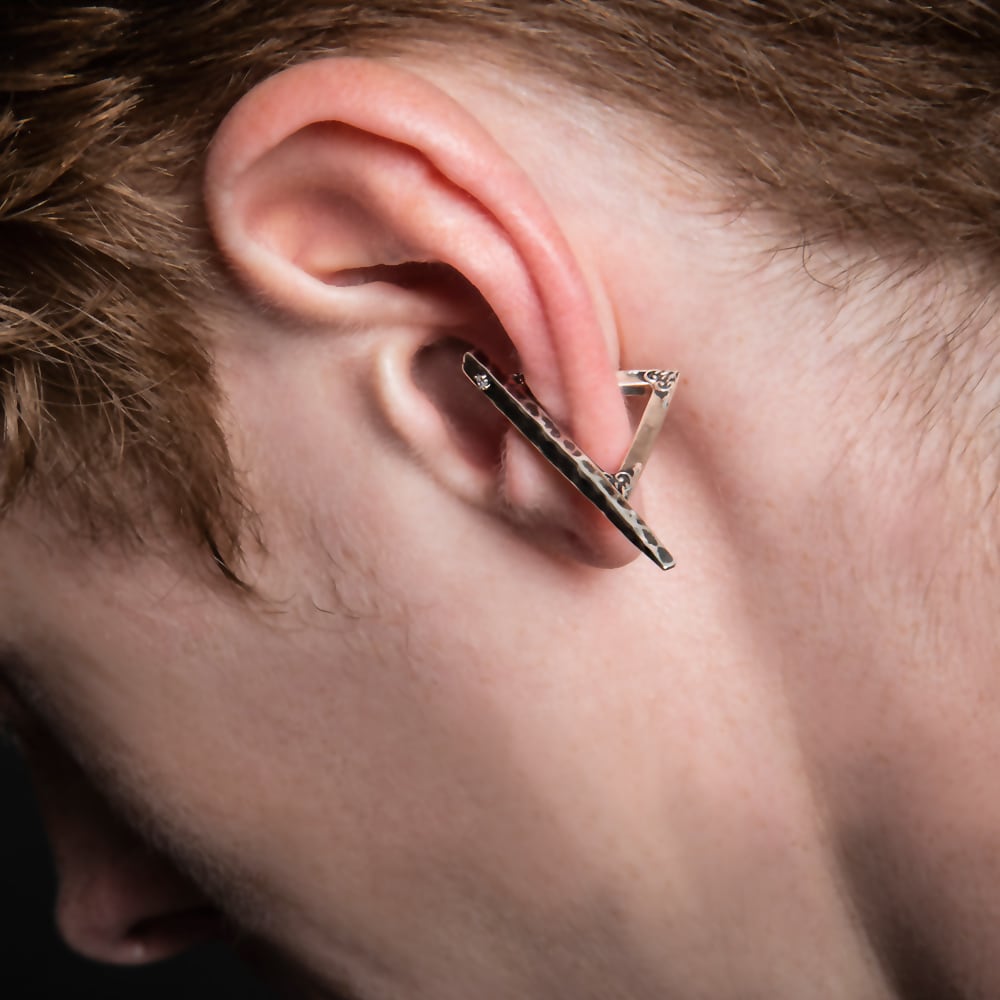 The triangular ear cuff with a long side gives a sharp impression in mode.