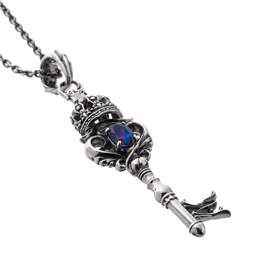 A pendant shaped like a regal key, crowned with authority and adorned with a mystic topaz that shimmers in shifting hues of violet, blue, and green. Long regarded as a symbol of opening doors to happiness, the key motif is elevated here with the dignity and grandeur of a crown, offering the wearer a story of strength and allure.