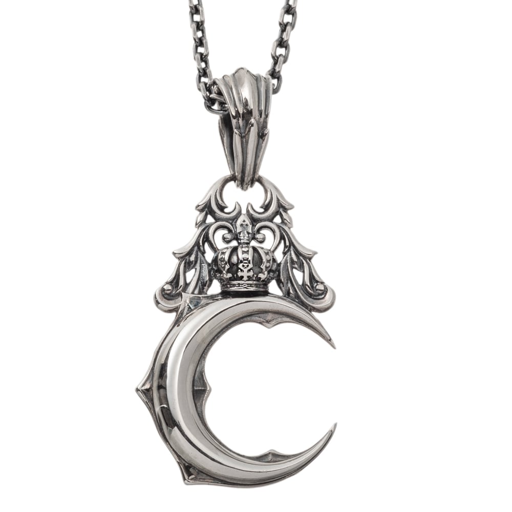 エレガントな曲線美で描かれた三日月モチーフのペンダント。神秘性とロマンティシズムを宿すこの意匠は、古来より「光と闇」「太陽と月」といった相反する存在を結びつける象徴とされてきました。両面を立体的に仕立てた月は、レイヤードとトレサリーの装飾と重なり合うことで奥行きを増し、輝き、存在感を放ちます。トップにはブランドを象徴するクラウンと唐草の装飾をあしらい、荘厳さと華やぎを同時に表現。シルバー925の質感は、繊細に磨き上げられた輝きと燻しによる陰影が呼応し、ジュエリーを超えたアートオブジェとしての美学を際立たせます。提携アトリエの熟練職人が一点ずつ丹念に仕上げることで、クラフトマンシップと芸術性が融合した唯一無二の作品へと昇華した作品。