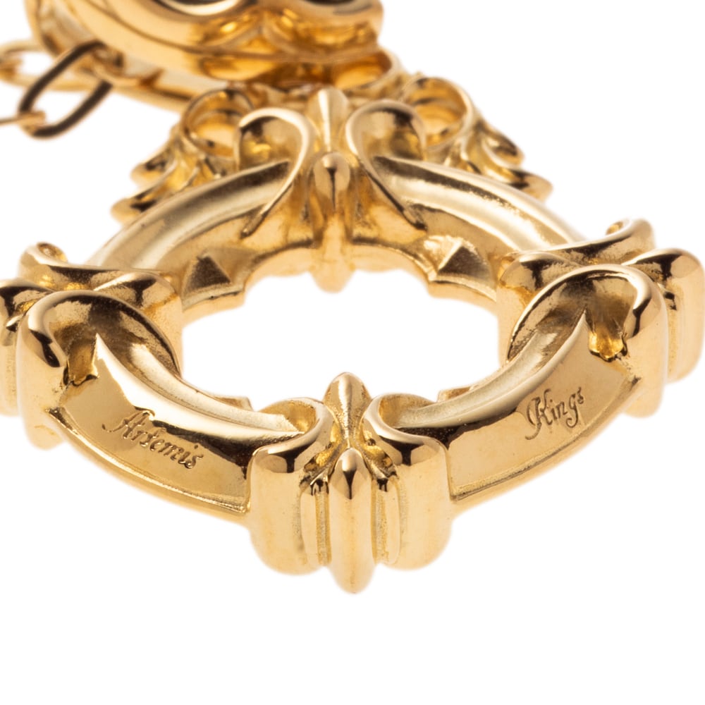 温かみのある10金カラーでコーティングしたSV925に、ゴシック建築を思わせるトレサリーとレイヤードを重ねたリングモチーフのペンダント。マーキスカットのブラックストーンをバチカンに配し、艶やかな金色に凛とした陰影を与えます。リングは“永遠・絆・無限”の象徴。光を拾い、角度によって表情を変える姿は、まさに身にまとうオブジェ。仕立てはブランドのディレクションのもと、信頼する提携アトリエで熟練職人が一点ずつ。面取りから光沢のトーンまで緻密に整え、上質な存在感を宿しました。フィガロと2種のアズキを組み合わせたマルチデザインチェーン付き。背面にはブランドサインとSV925、3つのホールマークを刻印。日常の装いを気高く引き上げる、タイムレスな一本です。